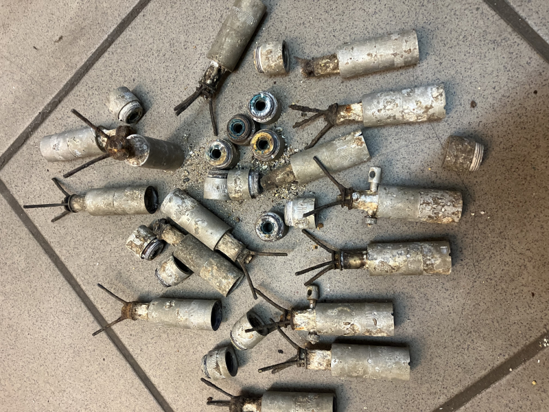 wie abgebildet, alles Deko, leer, inert. Konvolut Dreidornzünder und Teile davon, alle Zündhütchen fehlen.