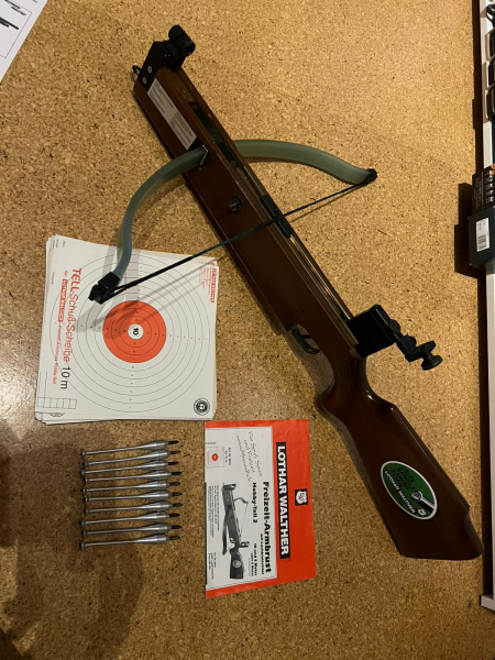 Hallo, verkaufe meine alte Lothar Walther Match Armbrust im gepflegter Zustand, inkl. Diversem Zubehör wie spannhebel, Bolzen und Scheiben, siehe Fotos.