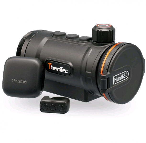 Das Thermtec Hunt 650 ist ein kompaktes extrem leichtes Wärmebildvorsatzgerät. Es wird mit einem passenden Adapter an einer bereits vorhandenen Tageslichtoptik montiert. Der integrierte VOx-Ceramic-Detektor verfügt über eine Auflösung von 640 x 512 Pixel bei einem Pitch von 12 µm. Die Objektivlinse misst 50 mm Durchmesser und ermöglicht eine Detektionsreichweite bis zu 2600 m. Das Magnesiumgehäuse des Thermtec Hunt 650 ist robust und vor Regen nach der Schutzart IP67 geschützt. Die Bedienung erfolgt über eine mitgelieferte Bluetooth-Fernbedienung und gut erreichbare Bedienelemente auf der Oberseite.
