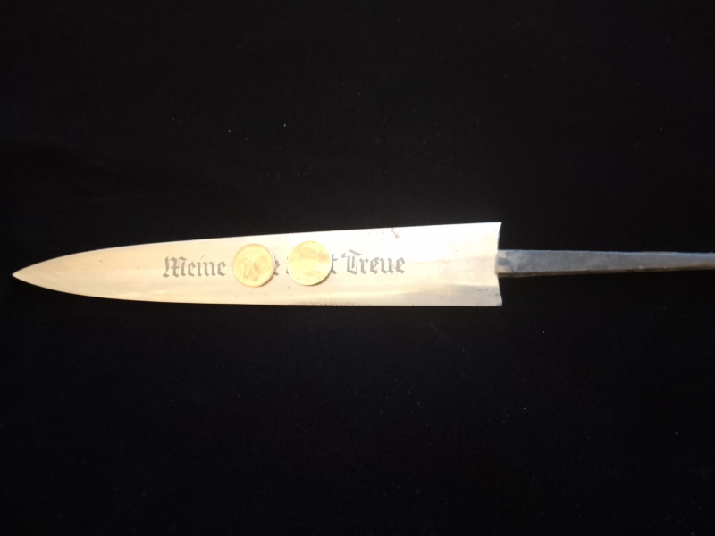 Vorderseitige Devise der XX, rückseitig eine Widmung eines Sturmbahnführers, Hersteller Klinge eindeutig im Gesenk geschmiedet, blau gepliestet so wie es sein sollte, geätzt, keine Laserung, meiner Meinung nach, altes Stück,Herstellung vor 1945 kann nicht garantiert werden, aber mit Sicherheit keine neuzeitlich Anfertigung, Klinge war noch nie verbaut bitte Bilder beachten, ohne Obligo