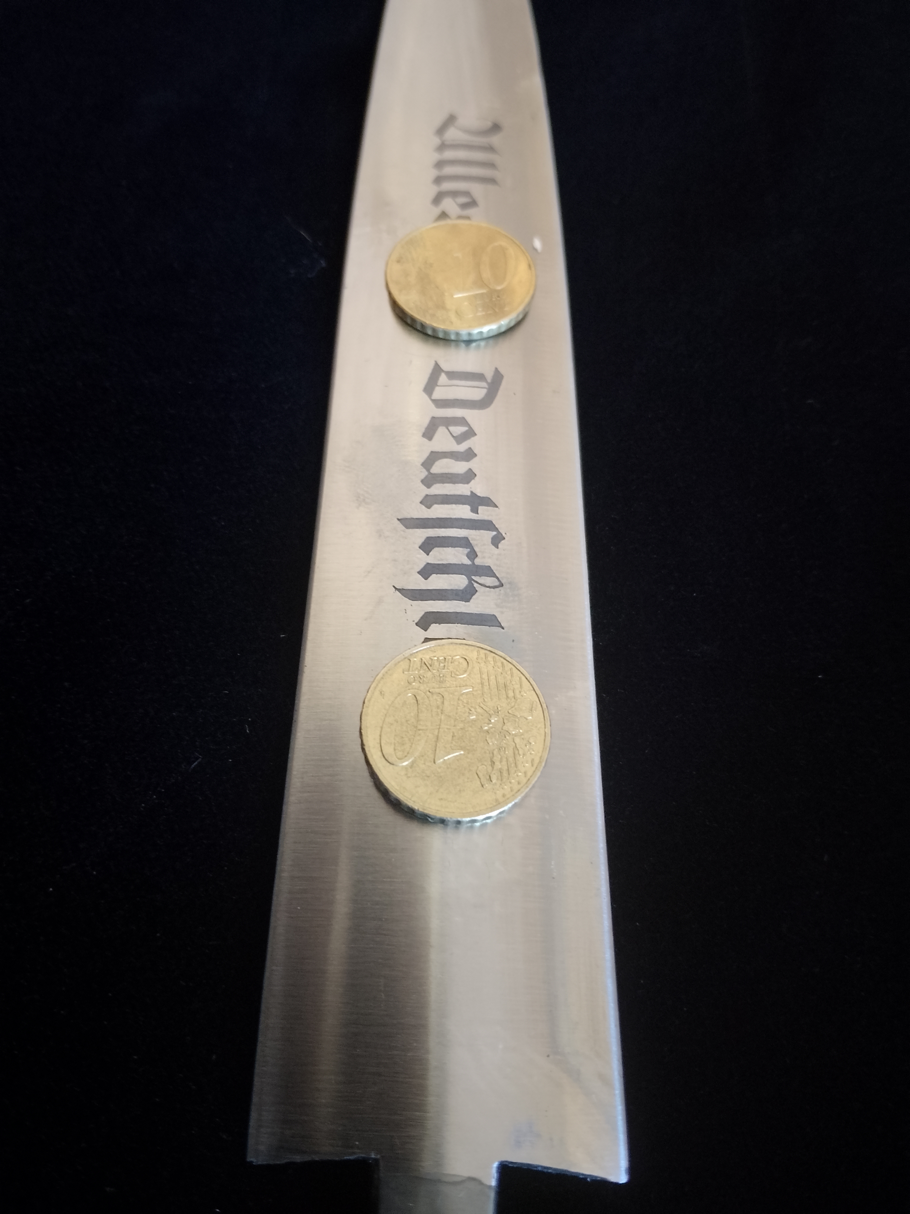 Klinge eindeutig im Gesenk geschmiedet, Klinge blau gebliestet so wie es sein sollte, Klinge doppelseitig geätzt, nicht gelasert.