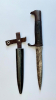 Dies ist nach meinem Kenntnisstand ein deutscher Grabendolch, Hersteller Carl Eickhorn aus Solingen. Die Klinge ist blank und "rostfarben" aber nicht rostnarbig, sie hat außer dem Herstellernamen keine erkennbaren Markierungen. Die Holzgriffe sind mit drei Nieten befestigt. Der Griffkopf ist rostnarbig und ohne Drücker. Die Scheide ist schwarz lackiert, der Halteriemen ist an der Scheide angenietet und es ist davon ein Stück abgerissen. Der Knopf ist noch vorhanden und mit einem Kreuz markiert. Die Klinge ist von Natur aus scharf und wohl nicht nachträglich geschärft. ___/___