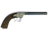 Auf den ersten Blick wie ein Hinterlader wirkt diese diese ausgefallene Perkussionspistole. Es handelt sich um eine Scheibenpistole aus dem 19. Jh. mit dem typischen, kannelierten Griff und Kastenschloss. Wo aber sind Hahn und Piston? Beim Abkippen des Laufes löst sich das Rätsel: Der Lauf selbst spannt das innen liegende Schloss, ähnlich einer modernen Schrotflinte. Dabei wird auch das Piston sichtbar und das Zündhütchen lässt sich aufsetzen. Der Lauf trägt den Punzen "A.CARON" mit entsprechendem Logo. Die Waffe ist 33 cm lang und hat das Kaliber 6,35 mm. Der Zustand ist hervorragend zu bezeichnen; selbst die ursprüngliche Blau-Brünierung des Laufes ist noch zu ca. 80% erhalten. Eine ausgefallene Konstruktion in bestem Sammlerzustand!