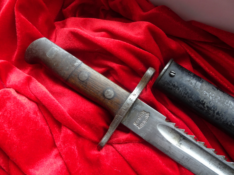 Sie bieten hier auf ein altes originales Bajonett mit Sägerückenklinge Schweiz, Hersteller Waffenfabrik Neuhausen kplt. mit Stahlscheide, für das Alter noch gut erhalten, Drücker funktioniert, sehr schönes gut erhaltenes Sammlerstück, garantiert alt und original, darauf gewähre ich uneingeschränktes Rückgaberecht, ebenso bei falscher Beschreibung, ansonsten da Privatverkauf keine Gewährsübernahme!