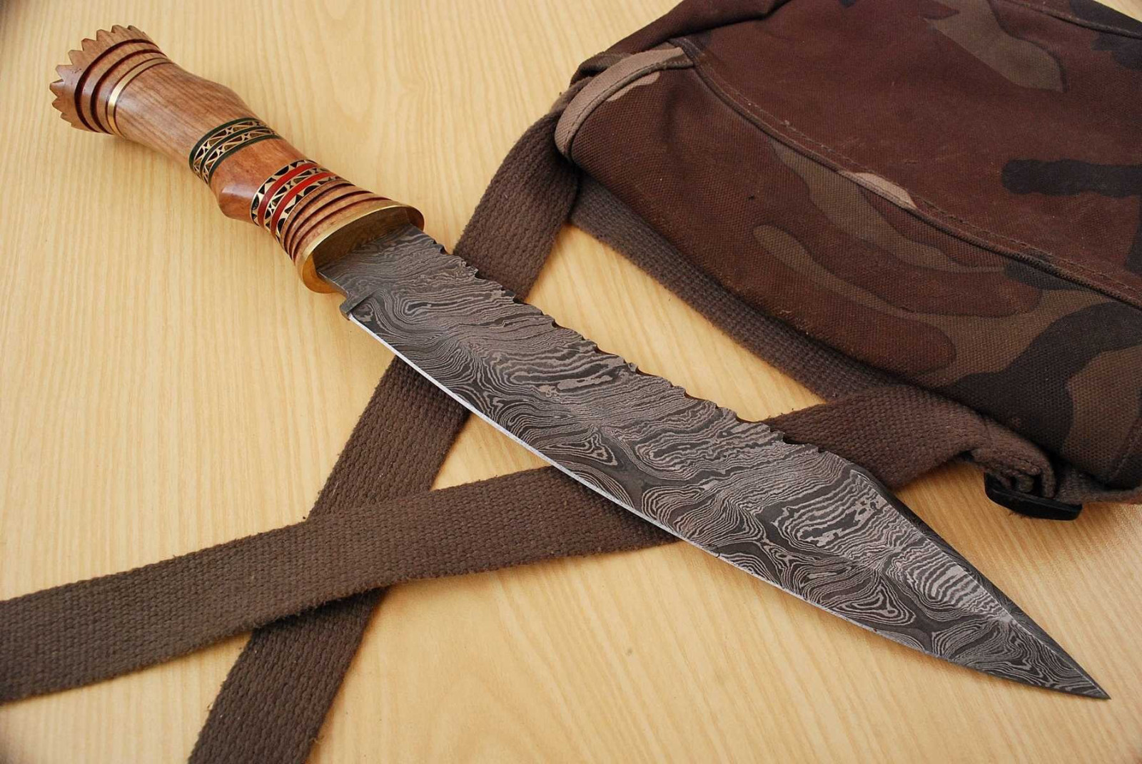 Custom Handmade Damascus Steel Hunting Bowie Knife wood und Rindleder #99