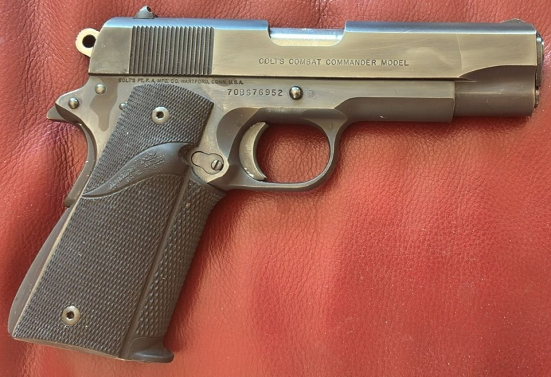 Colt Combat Commander .45 ACP in 4,25 Zoll Lauflänge. Die gute alte Qualität mit der Hochglanzoberfläche des Schlittens, der aber leider einen leichten Kratzer (siehe Foto) hat. Technisch guter, wenig geschossener Zustand. Privatverkauf! -siehe MyGun-