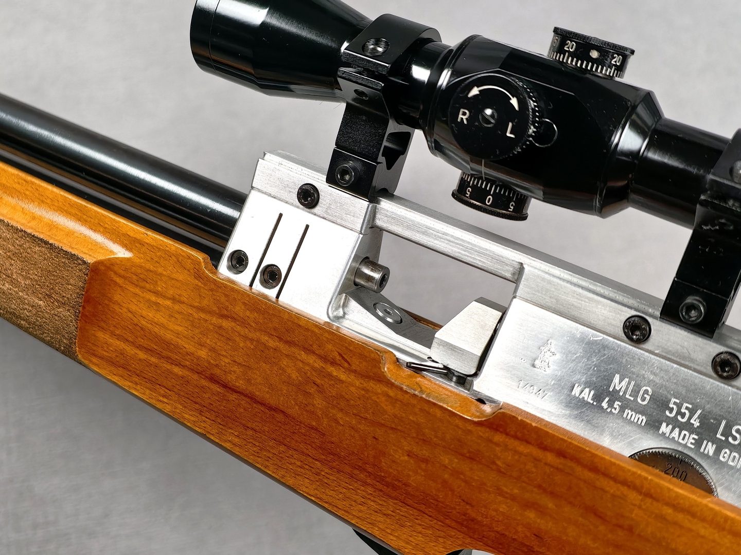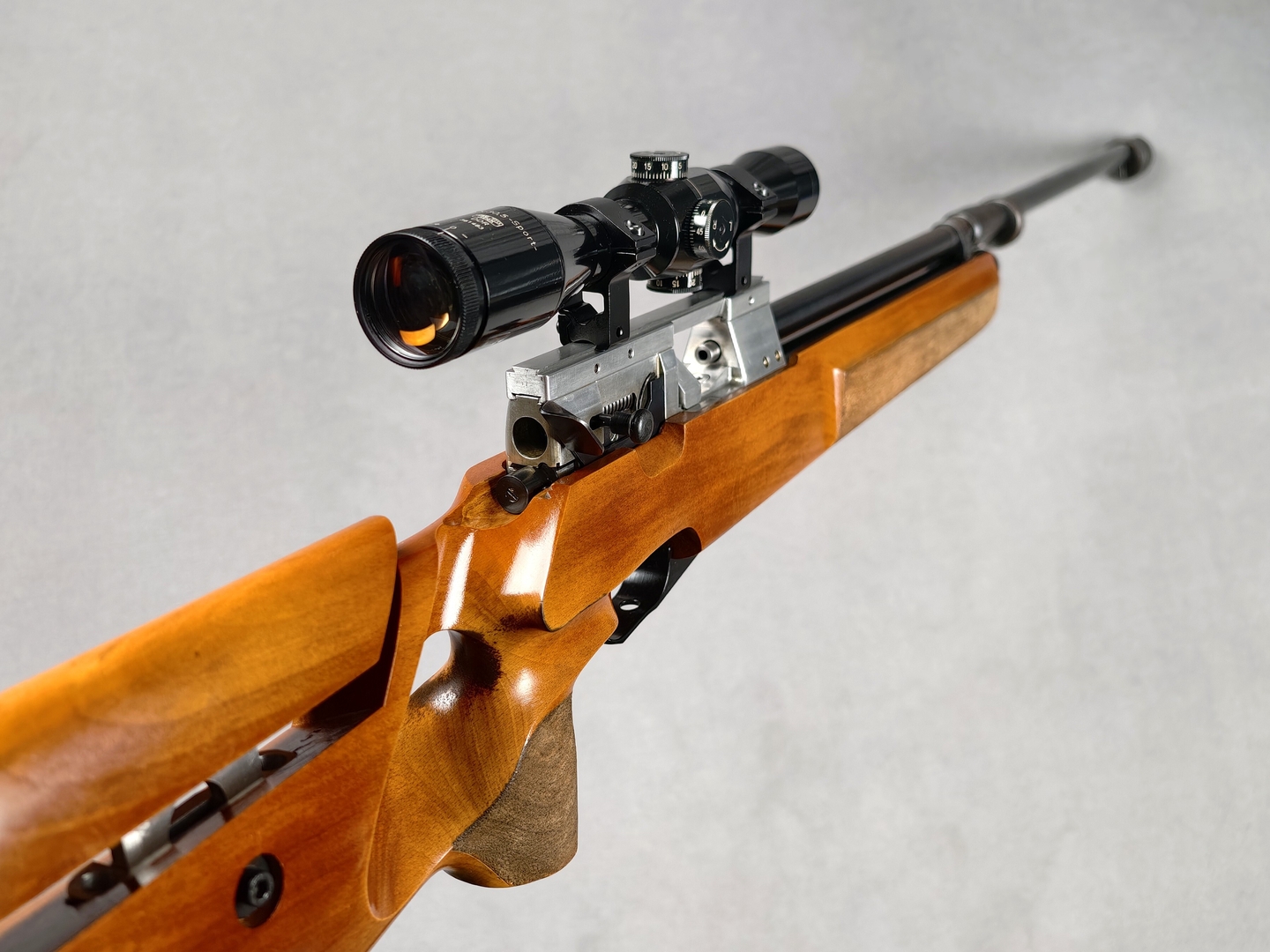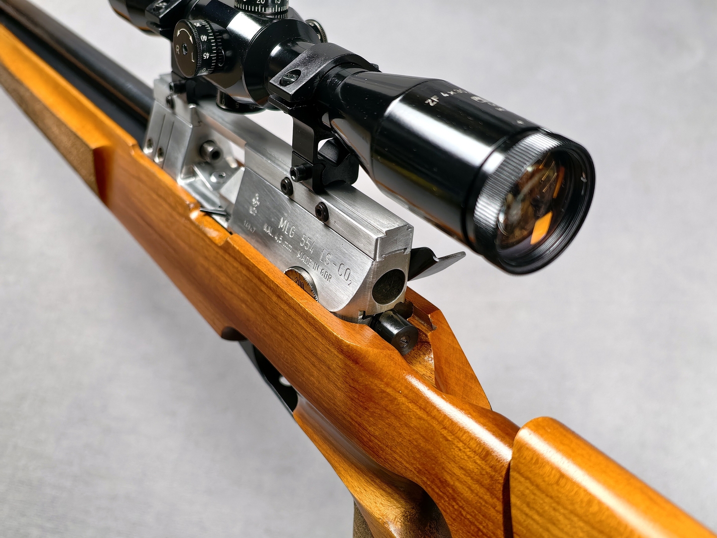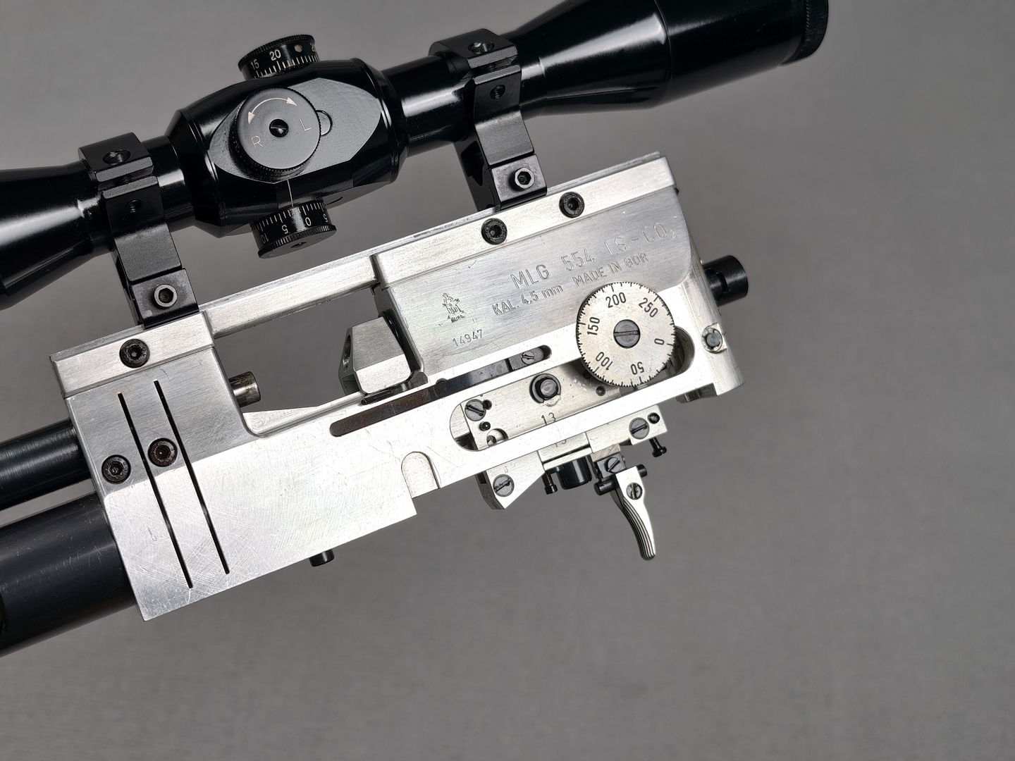 Aus unserer Privatsammlung versteigern mein Sammlerfreund und ich diese Woche ein absolutes Sahnestück - ein Haenel MLG 554 LS-CO2 (#14947) inklusive originalem Zielfernrohr Carl Zeiss Jena ZF 4 x 30,5 -Sport- (#361483). Die gesamte Konstruktion wurde vom Suhler Werk ausgelegt auf die Disziplin "Laufende Scheibe", erkennbar an dem ergonomisch anpassbaren Lochschaft, dem verlängerten Laufmantel mit variablen Gewichten sowie dem Zielfernrohr mit fein einstellbaren Doppelstacheln.