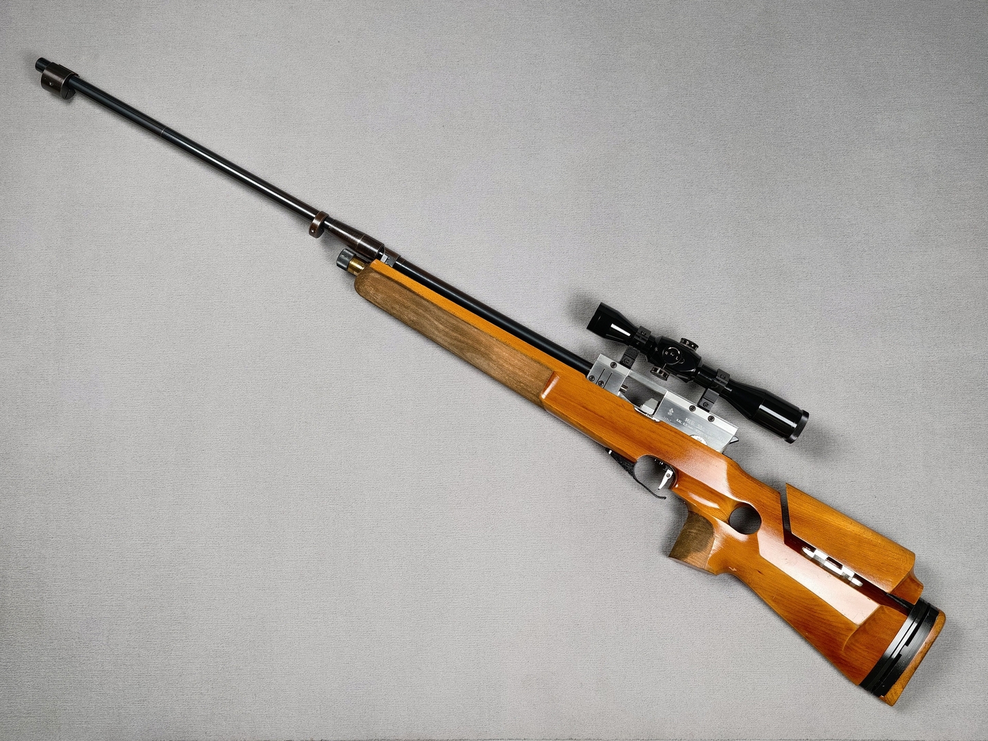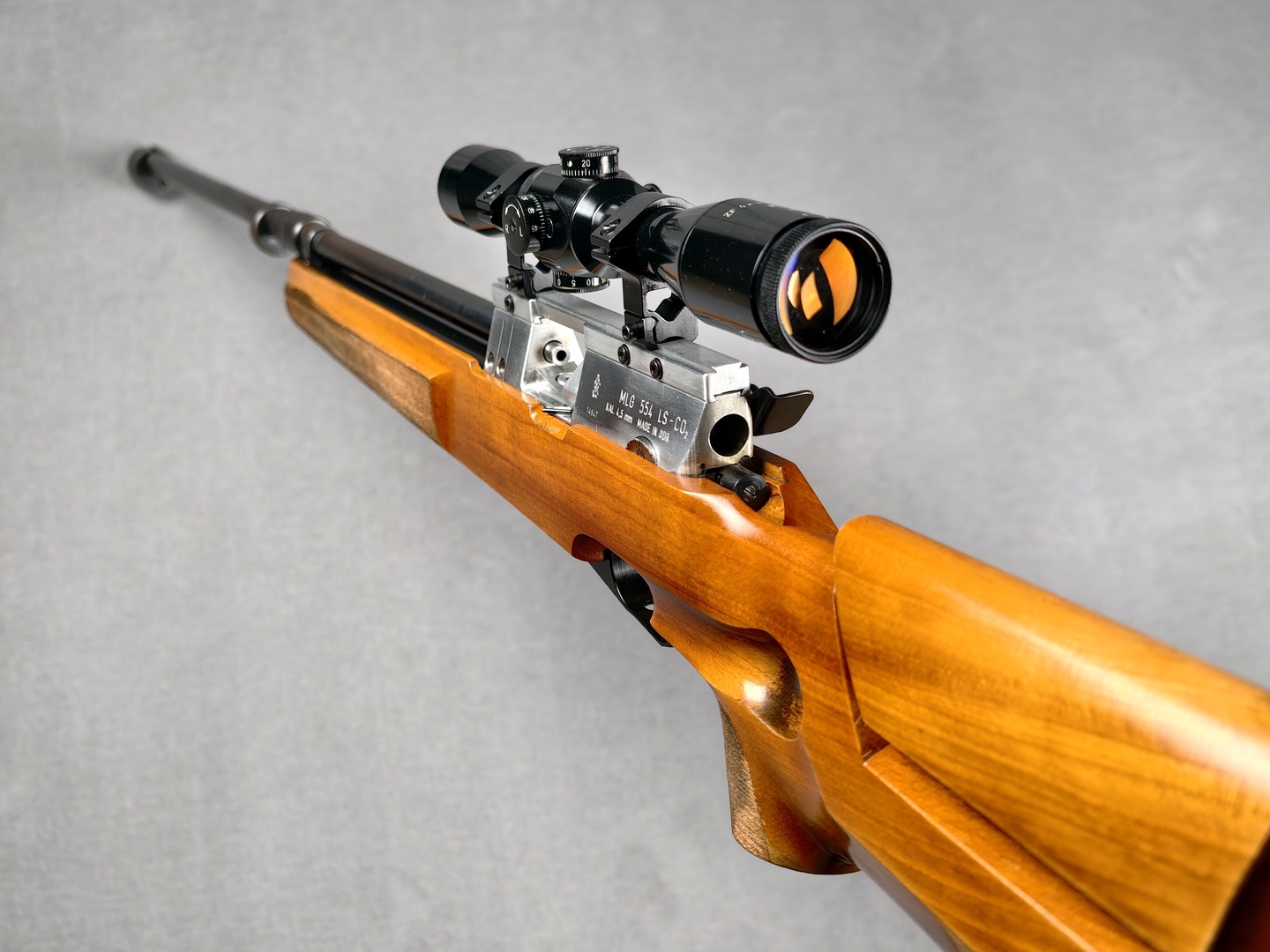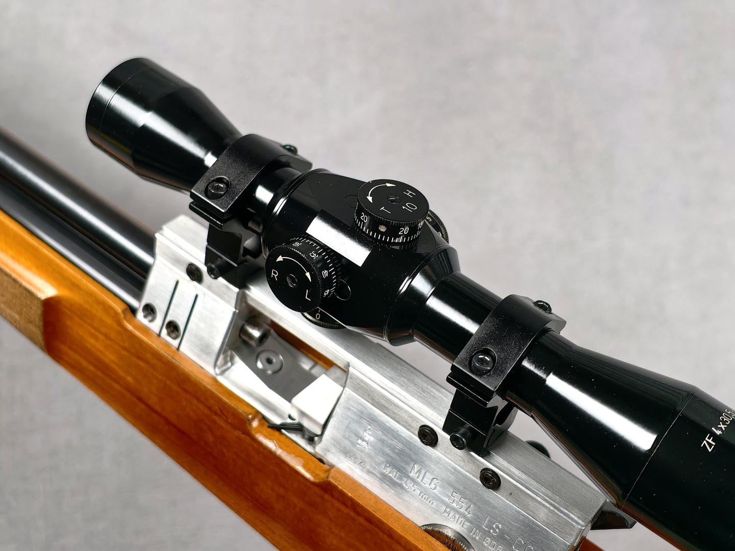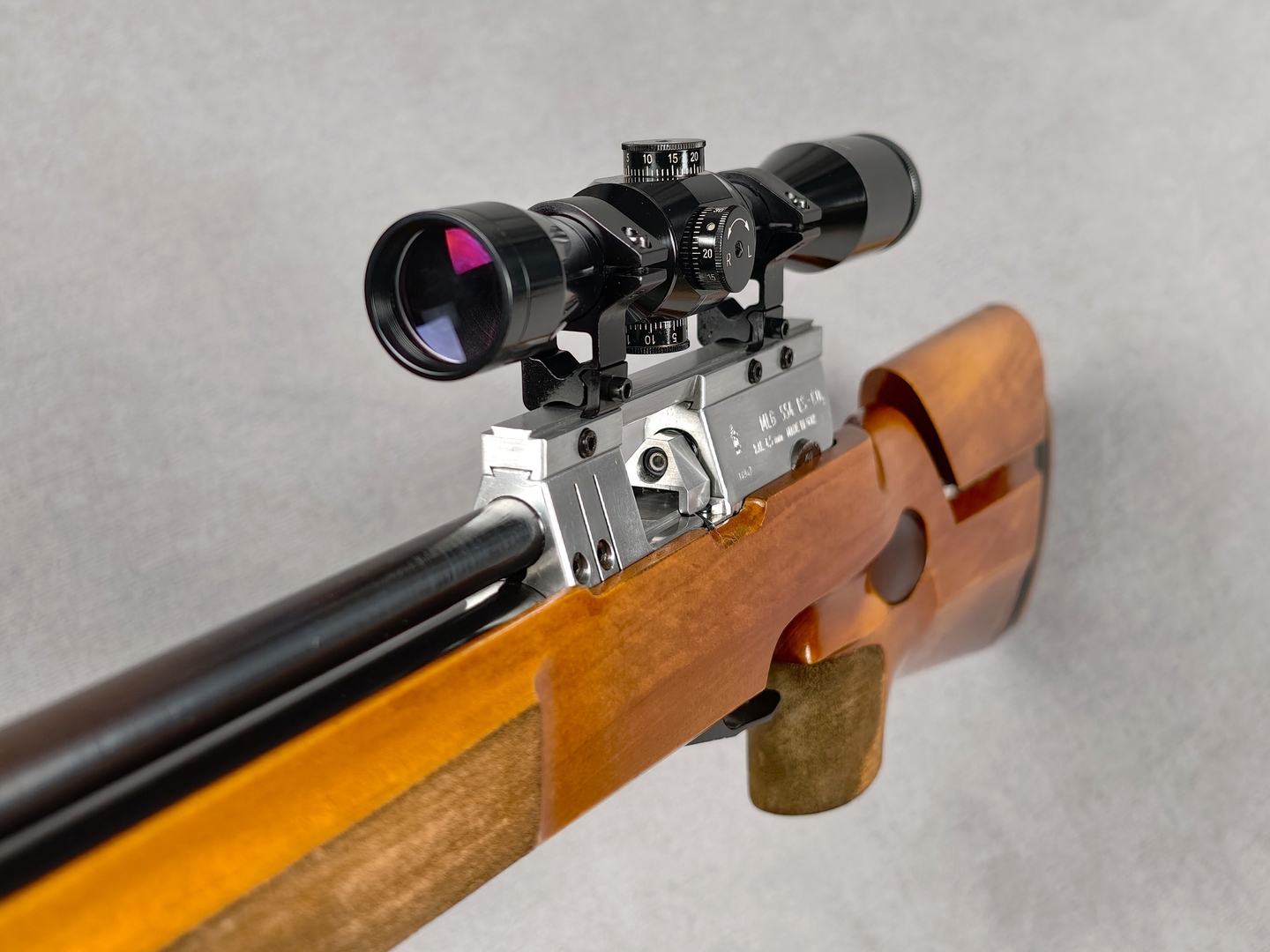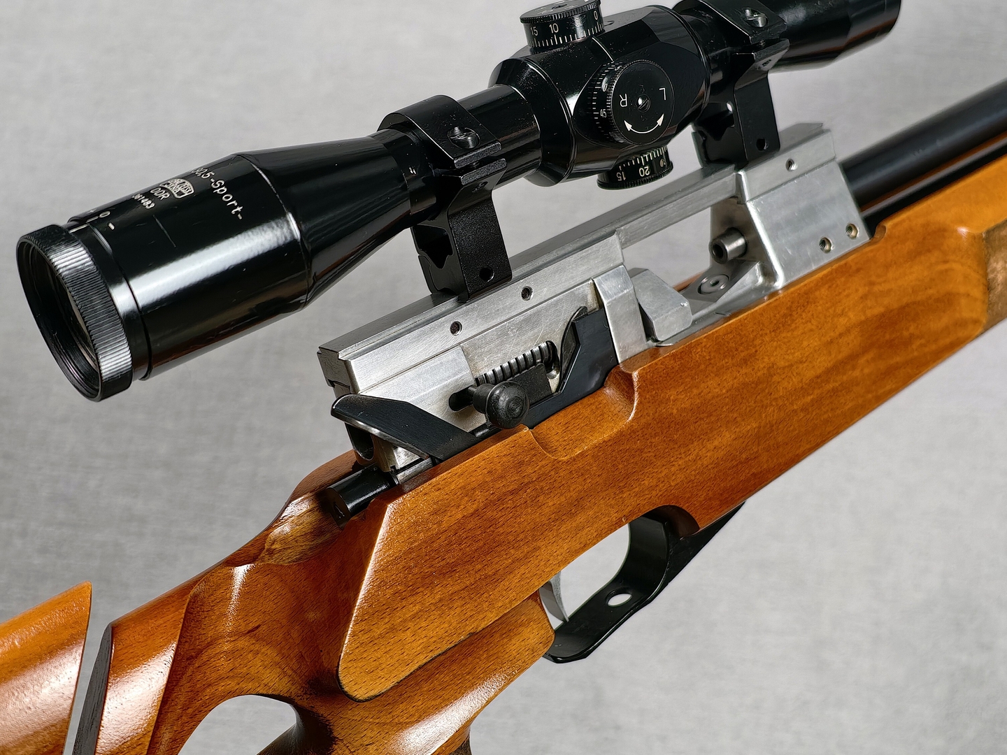 Aus unserer Privatsammlung versteigern mein Sammlerfreund und ich diese Woche ein absolutes Sahnestück - ein Haenel MLG 554 LS-CO2 (#14947) inklusive originalem Zielfernrohr Carl Zeiss Jena ZF 4 x 30,5 -Sport- (#361483). Die gesamte Konstruktion wurde vom Suhler Werk ausgelegt auf die Disziplin "Laufende Scheibe", erkennbar an dem ergonomisch anpassbaren Lochschaft, dem verlängerten Laufmantel mit variablen Gewichten sowie dem Zielfernrohr mit fein einstellbaren Doppelstacheln.