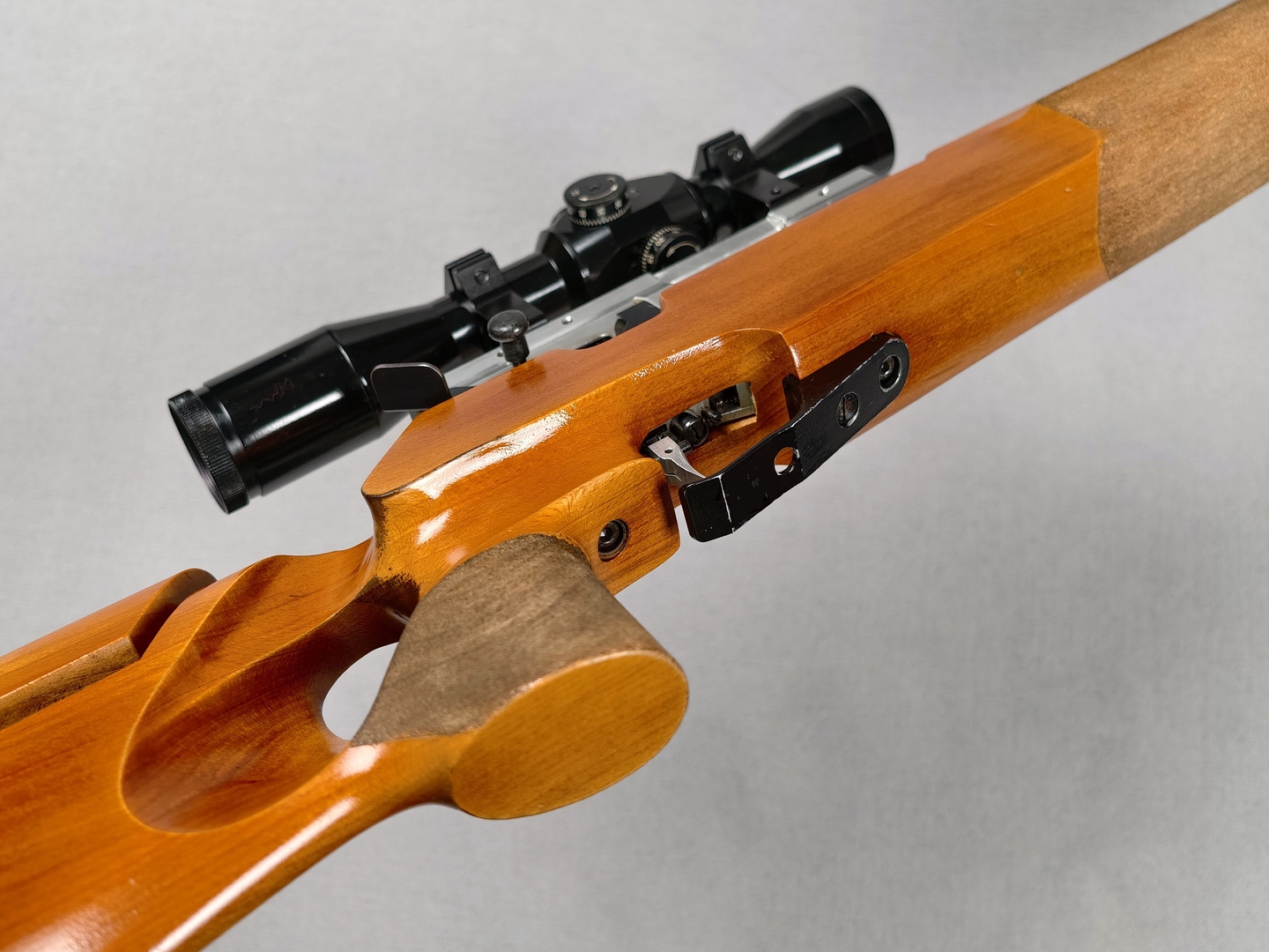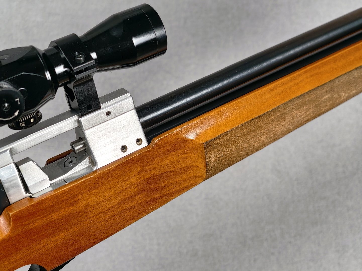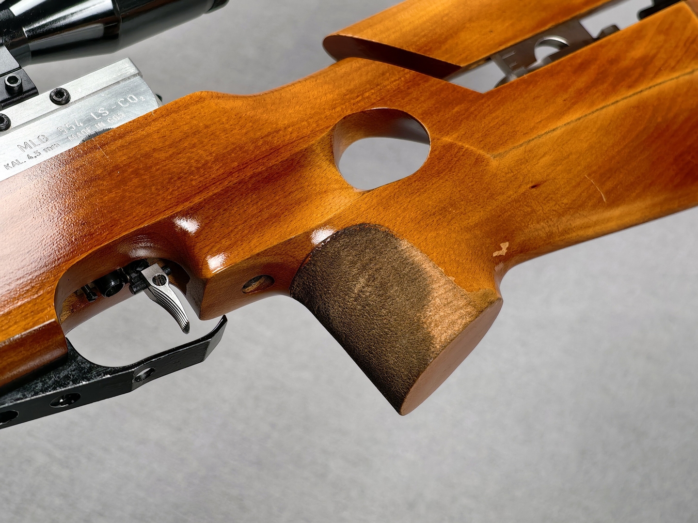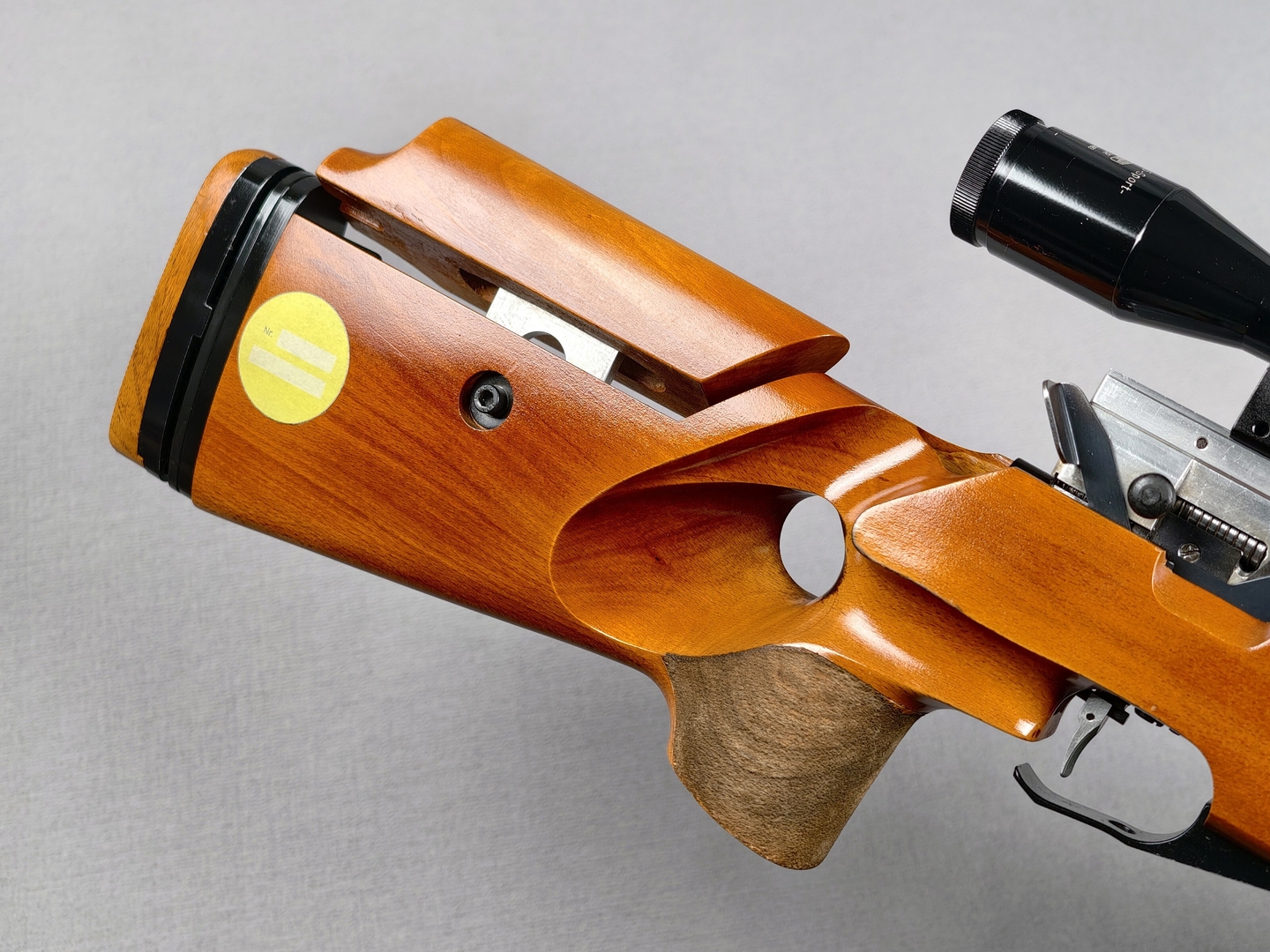 Aus unserer Privatsammlung versteigern mein Sammlerfreund und ich diese Woche ein absolutes Sahnestück - ein Haenel MLG 554 LS-CO2 (#14947) inklusive originalem Zielfernrohr Carl Zeiss Jena ZF 4 x 30,5 -Sport- (#361483). Die gesamte Konstruktion wurde vom Suhler Werk ausgelegt auf die Disziplin "Laufende Scheibe", erkennbar an dem ergonomisch anpassbaren Lochschaft, dem verlängerten Laufmantel mit variablen Gewichten sowie dem Zielfernrohr mit fein einstellbaren Doppelstacheln.