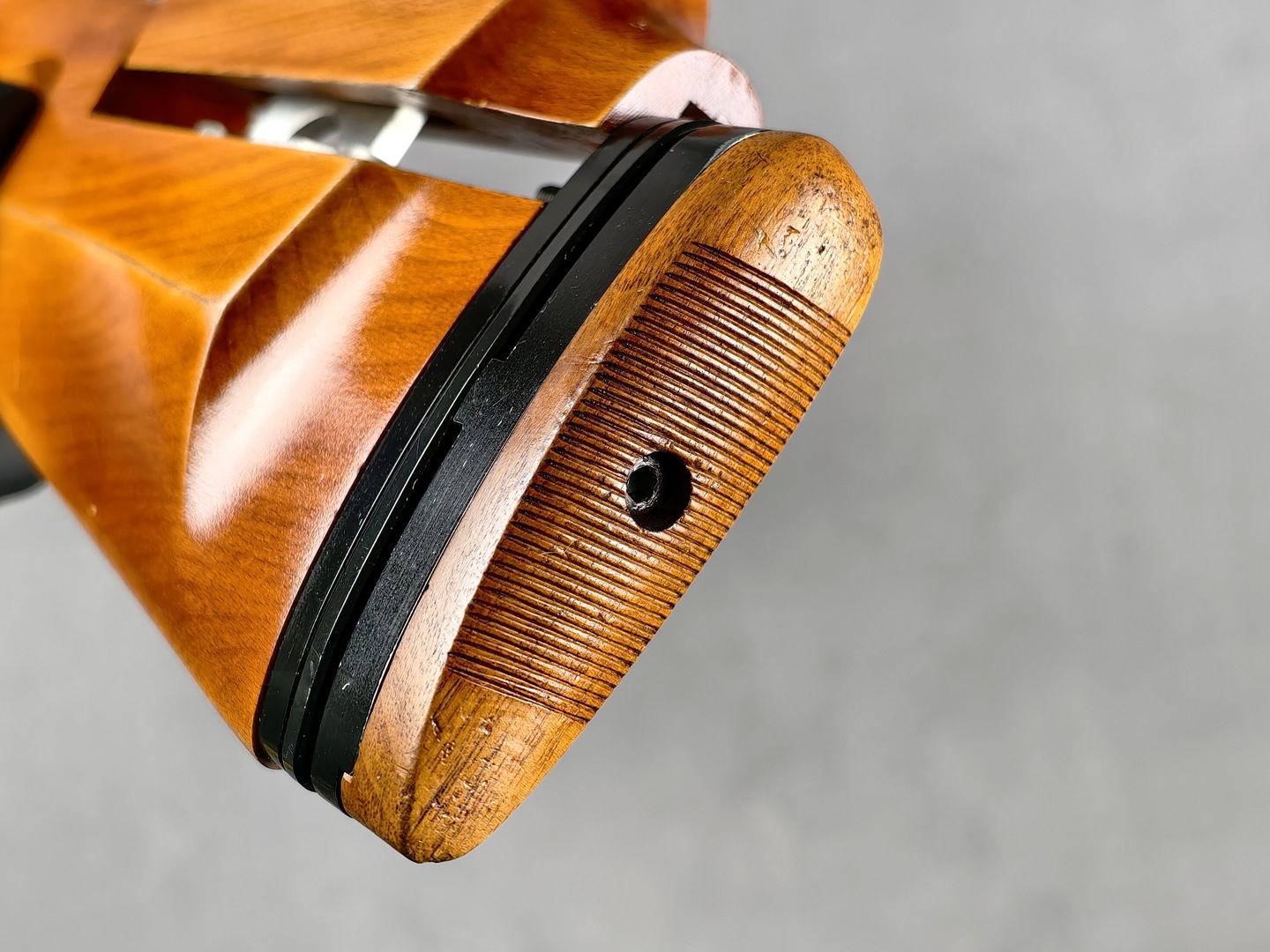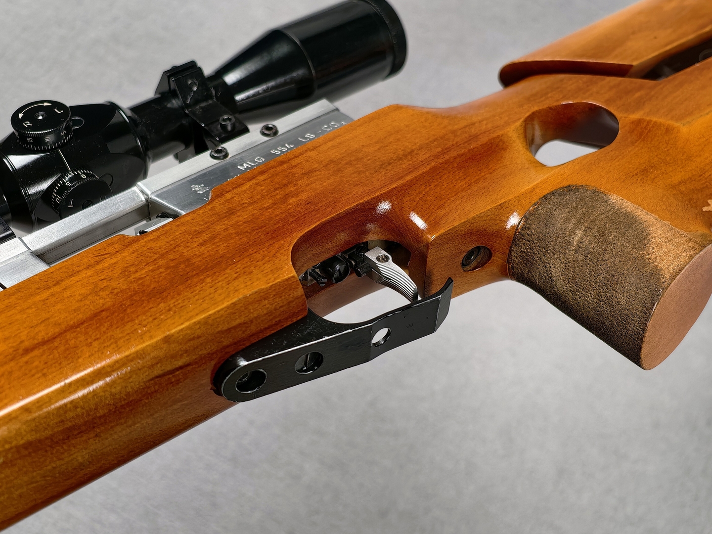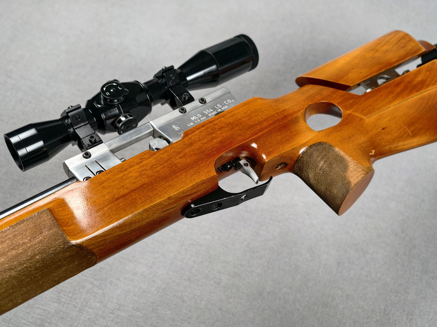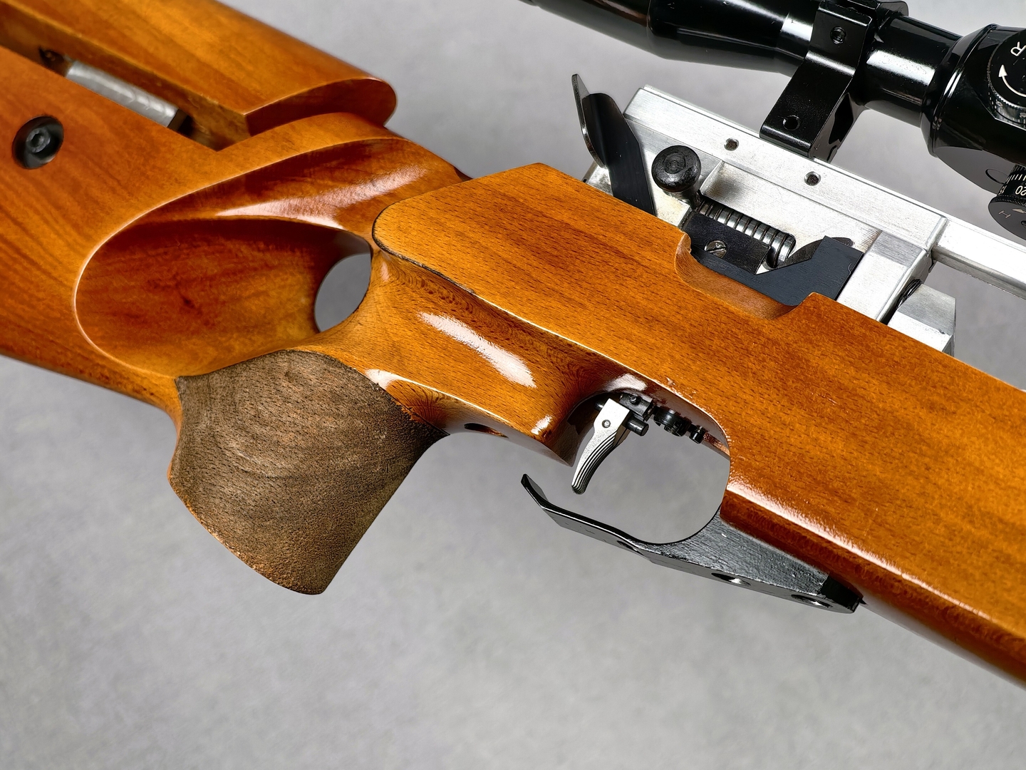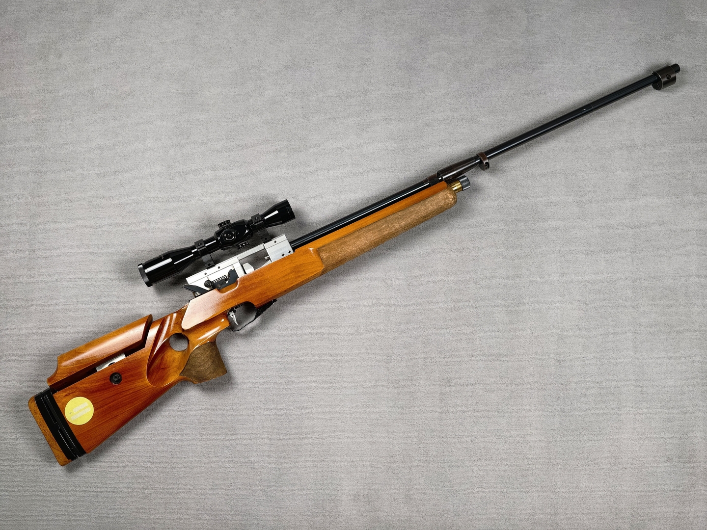 Aus unserer Privatsammlung versteigern mein Sammlerfreund und ich diese Woche ein absolutes Sahnestück - ein Haenel MLG 554 LS-CO2 (#14947) inklusive originalem Zielfernrohr Carl Zeiss Jena ZF 4 x 30,5 -Sport- (#361483). Die gesamte Konstruktion wurde vom Suhler Werk ausgelegt auf die Disziplin "Laufende Scheibe", erkennbar an dem ergonomisch anpassbaren Lochschaft, dem verlängerten Laufmantel mit variablen Gewichten sowie dem Zielfernrohr mit fein einstellbaren Doppelstacheln.