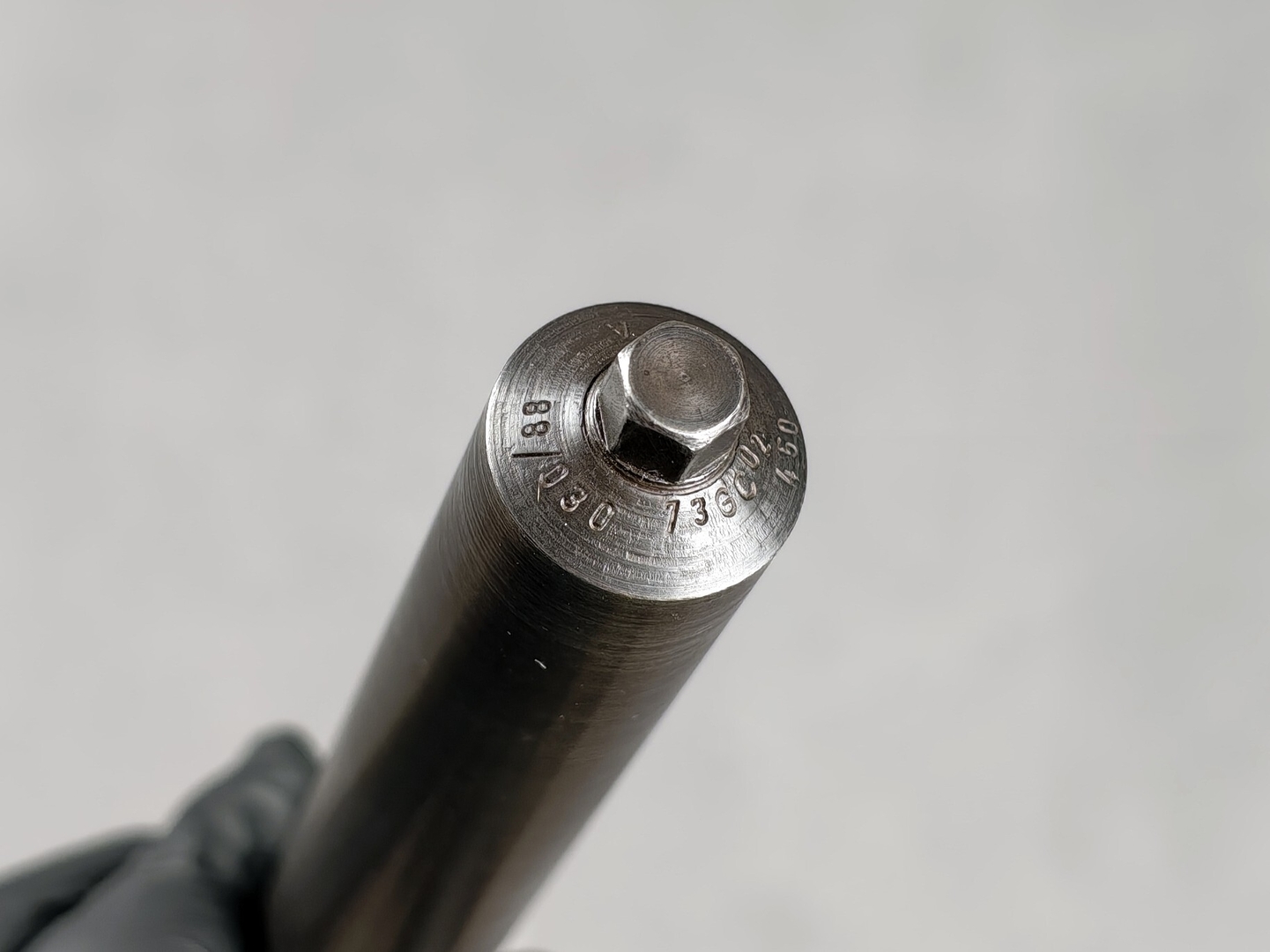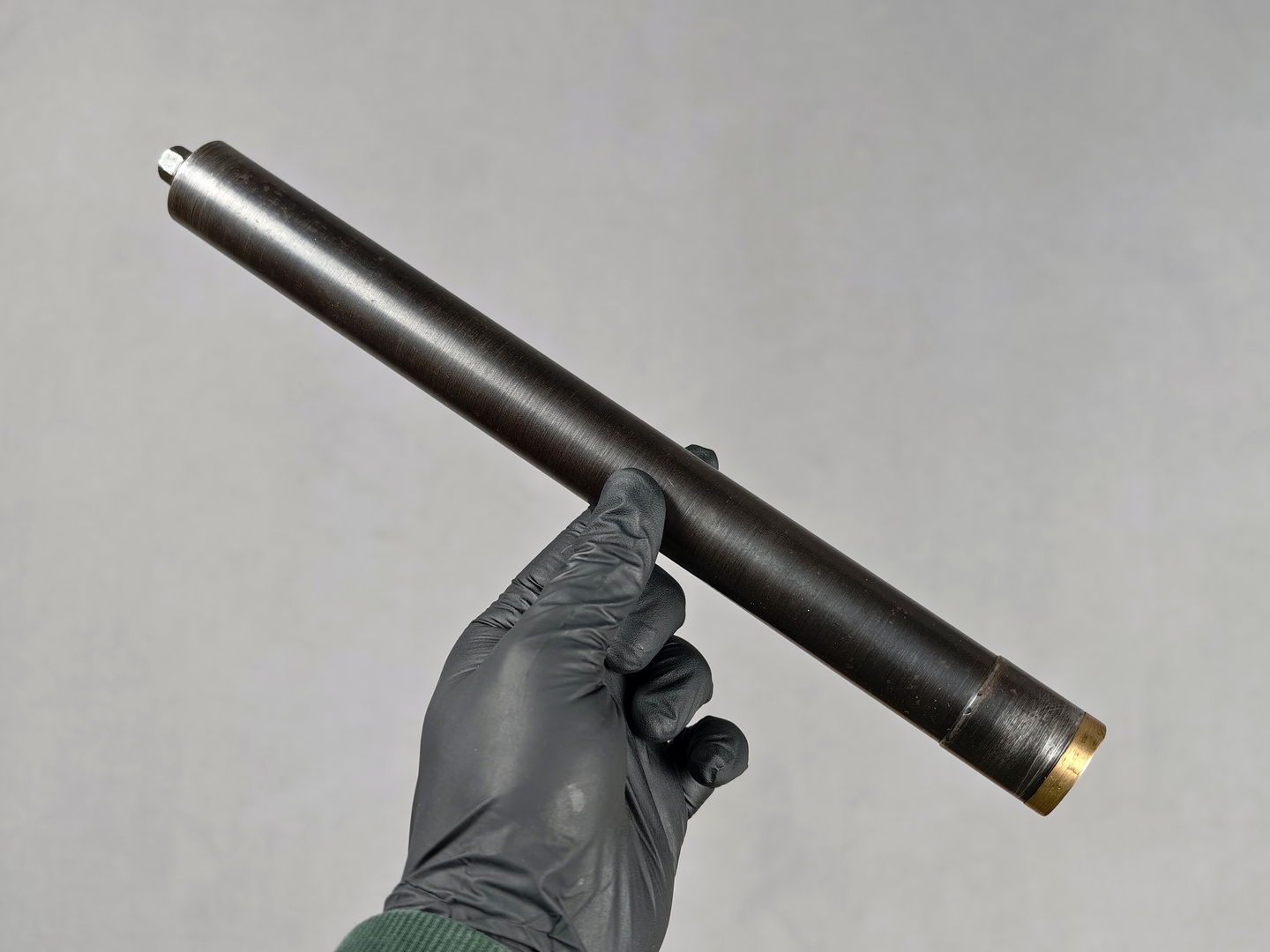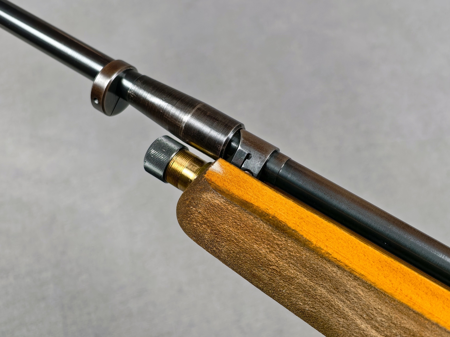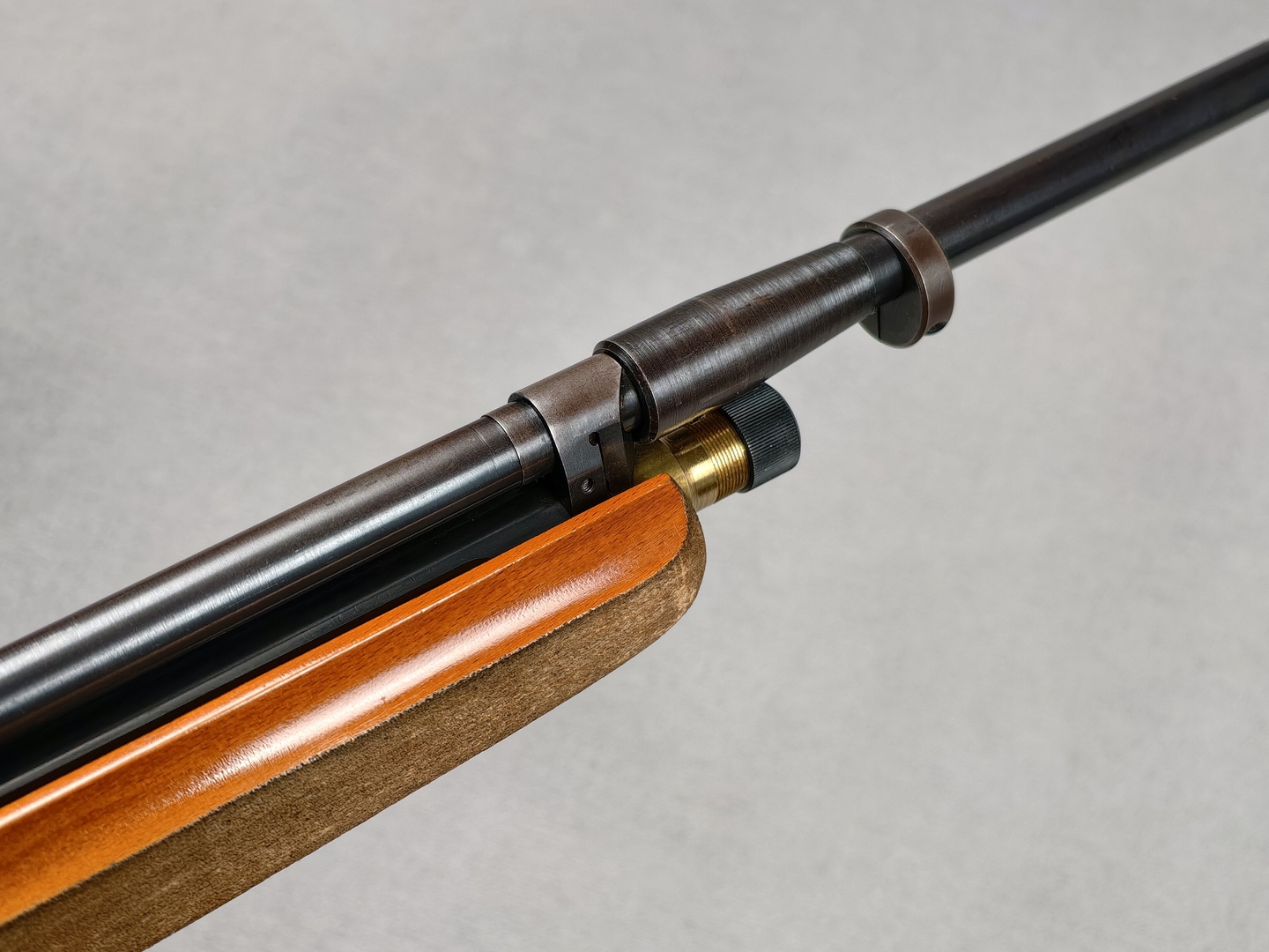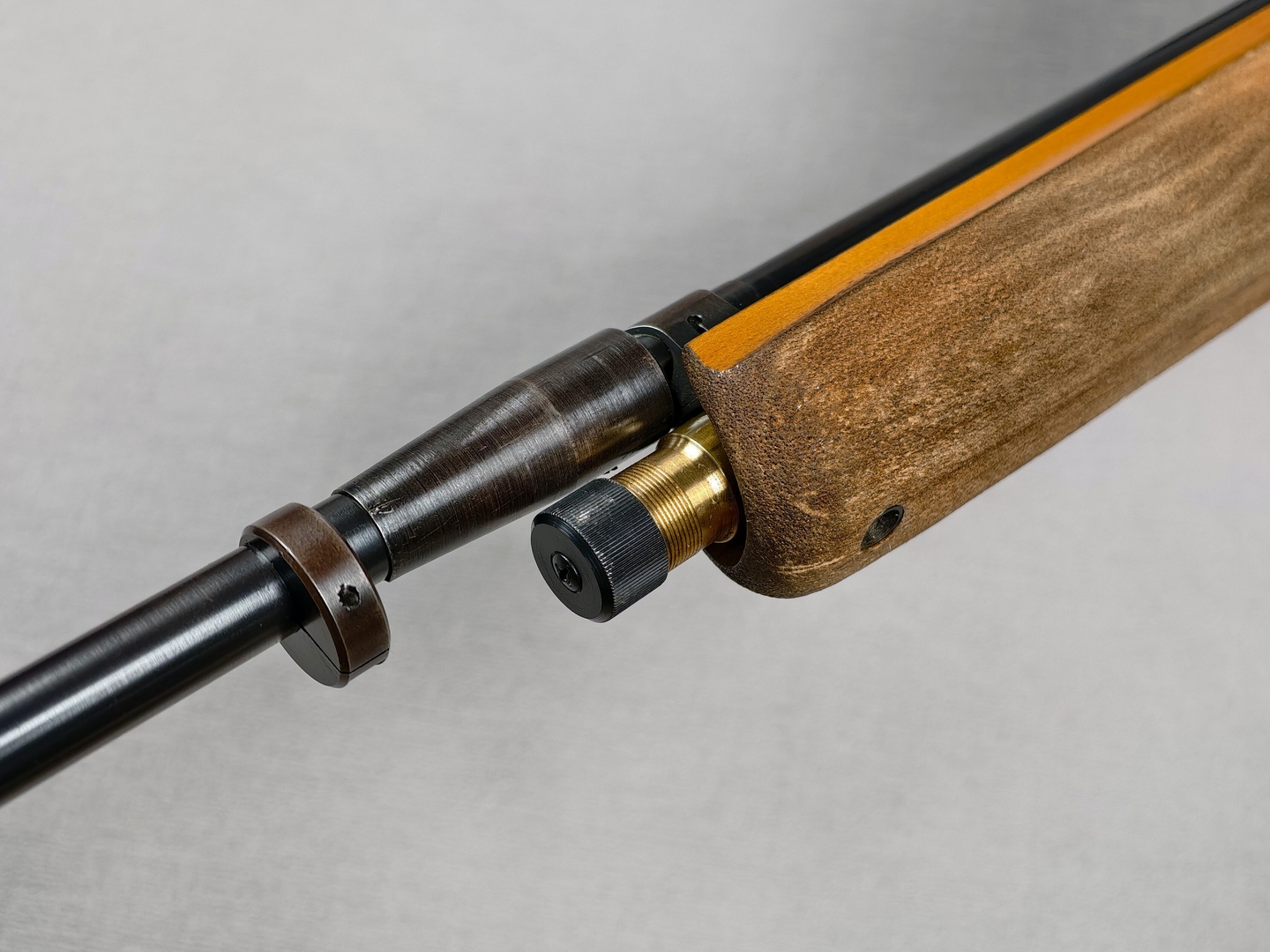 Eine originale CO2-Kartusche ist zwar mit dabei - sie hat die Seriennummer 030 und wurde 1988 produziert - jedoch kann man diesen alten Kartuschen bzgl. der Dichtigkeit nicht mehr vertrauen. Deshalb haben wir uns eine spezielle Adapterkartusche anfertigen lassen, in welche man gewöhnliche 12g-CO2-Kapseln einsetzt. Somit kann man das Gewehr kostengünstig und mit minimalem Aufwand (keine CO2-Flasche, Anschlussstücke etc. notwendig) benutzen.