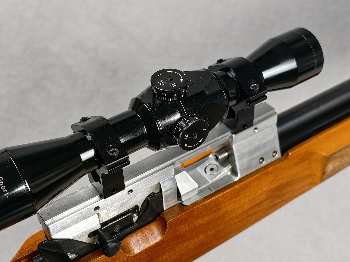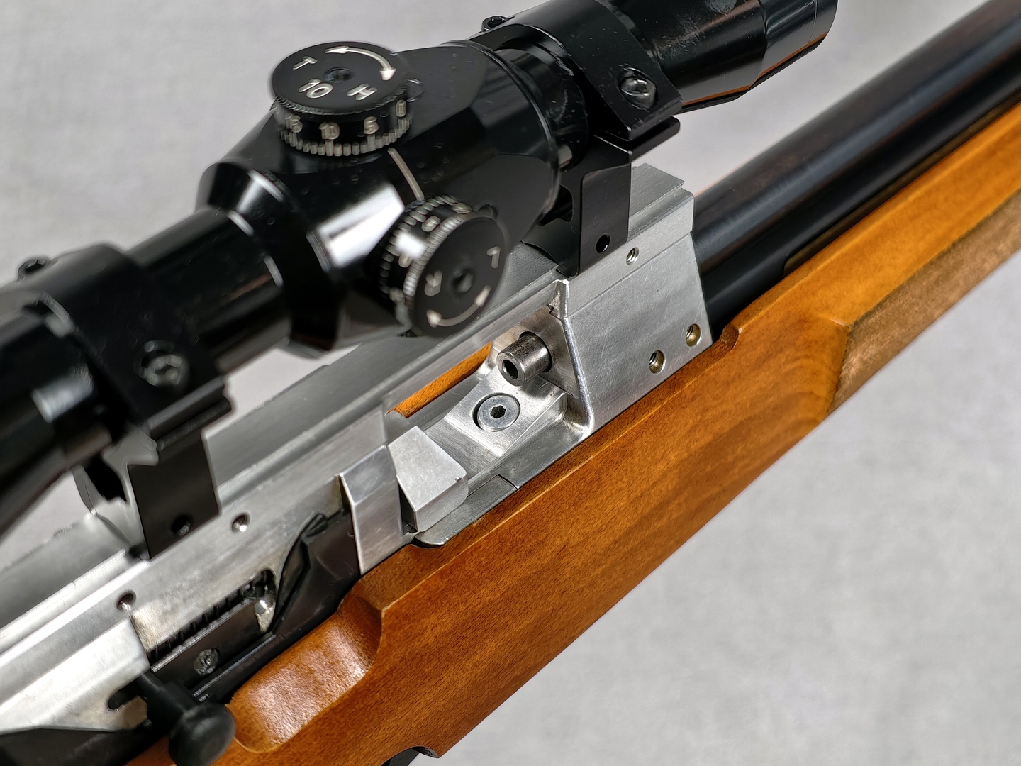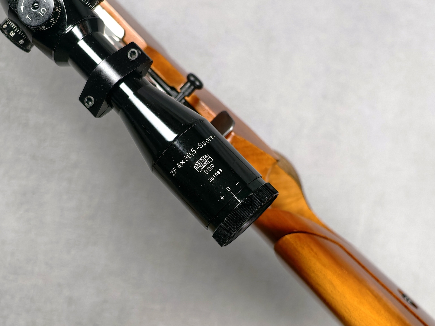 Auch mechanisch präsentiert sich das Exemplar im Topzustand. Das System wurde von uns turnusmäßig gewartet und regelmäßig einzelne Probeschüsse durchgeführt - mit beeindruckenden Trefferergebnissen. Die Linsen des Zielfernrohres sind klar, die Einstellung an allen 4 Türmen ist funktionstüchtig. Das Zielfernrohr mit Doppelstachel ist an sich schon eine echte Rarität, da diese Laufende-Scheibe-Exemplare natürlich nur auf Sonderbestellung gefertigt wurden.