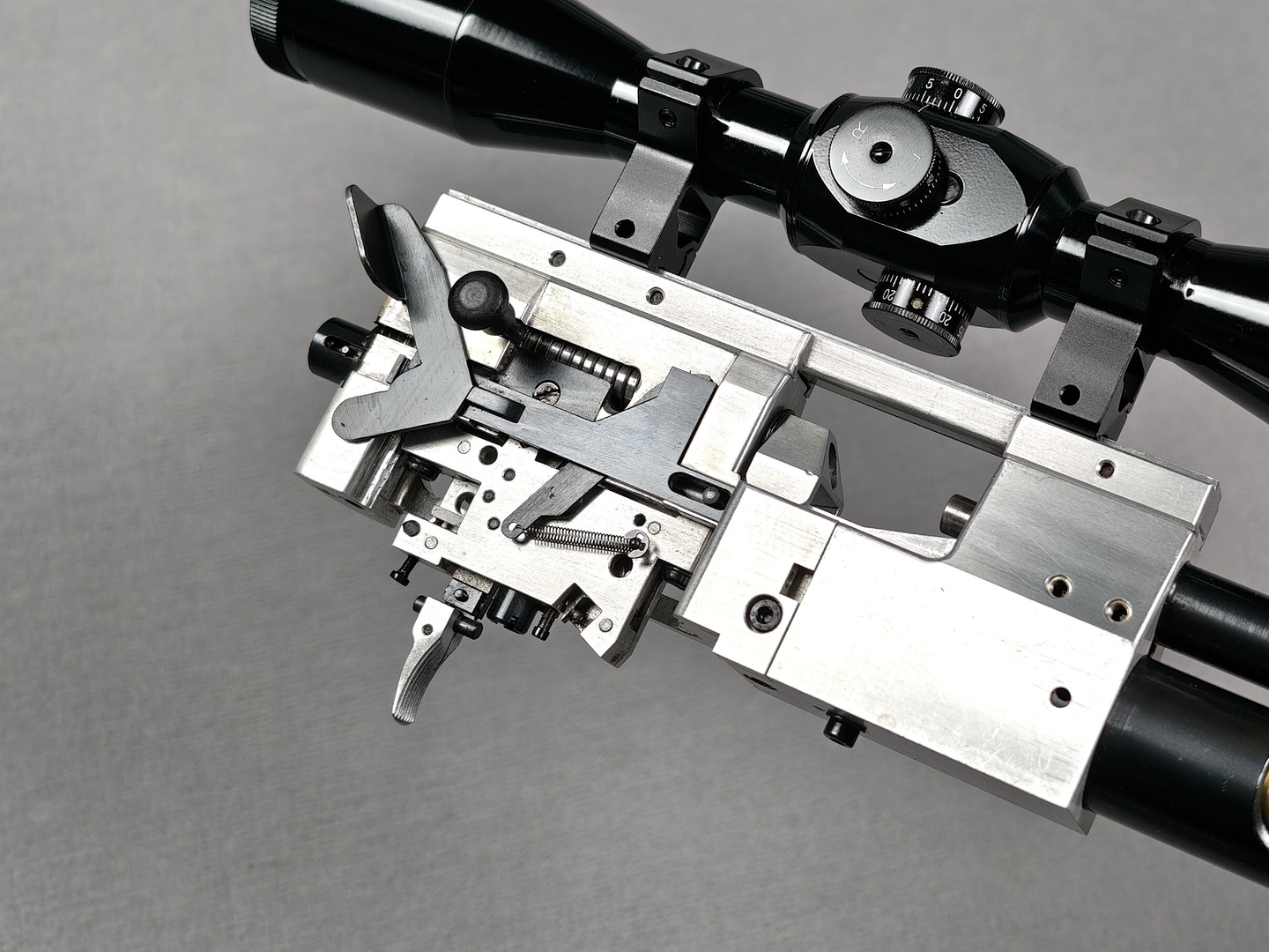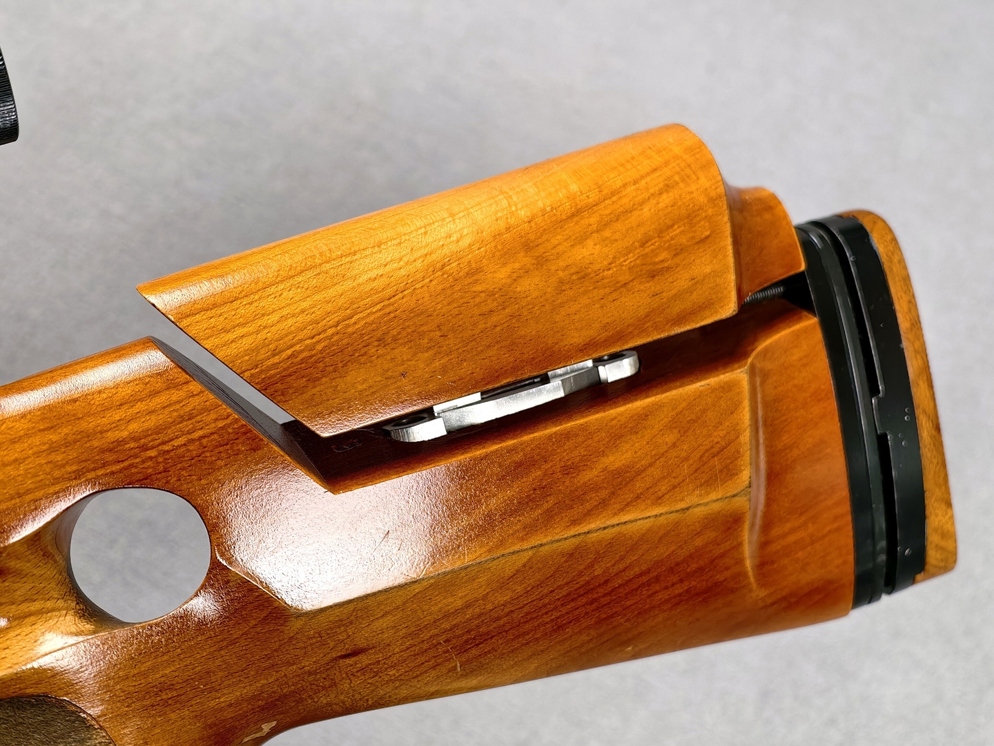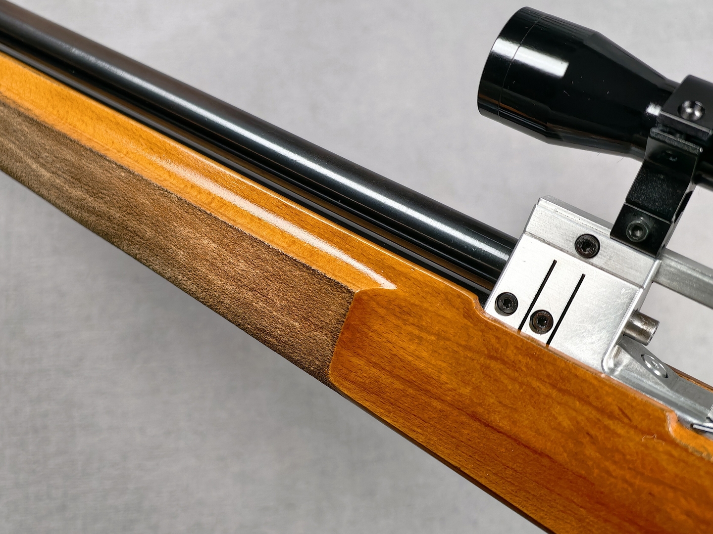Auch mechanisch präsentiert sich das Exemplar im Topzustand. Das System wurde von uns turnusmäßig gewartet und regelmäßig einzelne Probeschüsse durchgeführt - mit beeindruckenden Trefferergebnissen. Die Linsen des Zielfernrohres sind klar, die Einstellung an allen 4 Türmen ist funktionstüchtig. Das Zielfernrohr mit Doppelstachel ist an sich schon eine echte Rarität, da diese Laufende-Scheibe-Exemplare natürlich nur auf Sonderbestellung gefertigt wurden.