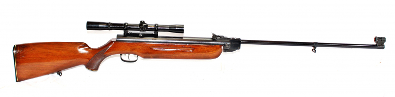 Das wohl weltbeste "Luftgewehr" aus dem Hause WEIHRAUCH mit der patentierten Laufverriegelung. Spiegelblanker, 56cm langer Lauf aus Spezialstahl für beste Präzision. Baujahr 1972. Vo 230m/s. Fein einstellbarer Matchabzug. Neue Laufdichtung. Mit zeitgenössischen Zielfernrohr 4x20 mit Absehen 1. Schön gemaserter Nussbaumschaft mit Fischhaut, Ziereinlagen und Deutscher Backe.