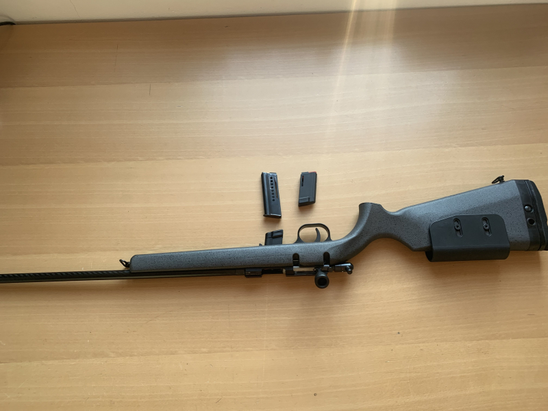 Sie bieten auf ein KK Gewehr der Marke Voere, Modell K 15 A, im Kaliber .22 LfB. Ich kann keine, oder nur ganz geringe Gebrauchsspuren erkennen. An der Waffe wurden Trageriemenösen nachgerüstet. Zusätzlich erhalten Sie 2 Magazine aus Kunststoff und ein grösseres aus Metall. Der Lauf ist aus Carbon. Dadurch wird die Waffe zu leichtesten Repetiergewehr überhaupt.