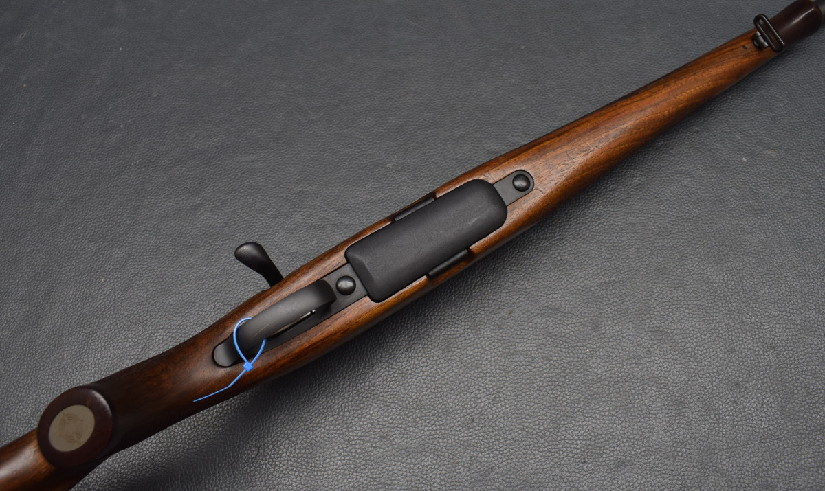 Nußbaumschaft mit Backe, Schaftkappe & Riemenbügeln Lauf sehr gut, Brünierung 97%, Schaft sehr gut
