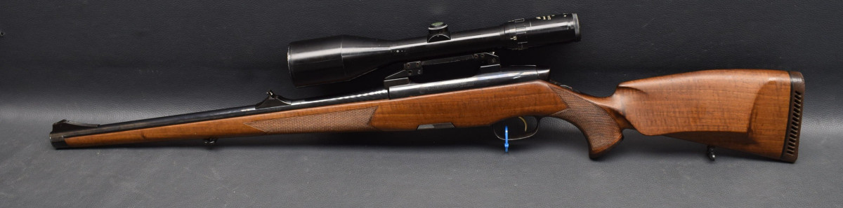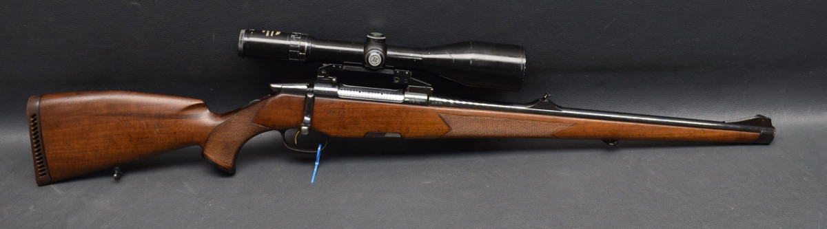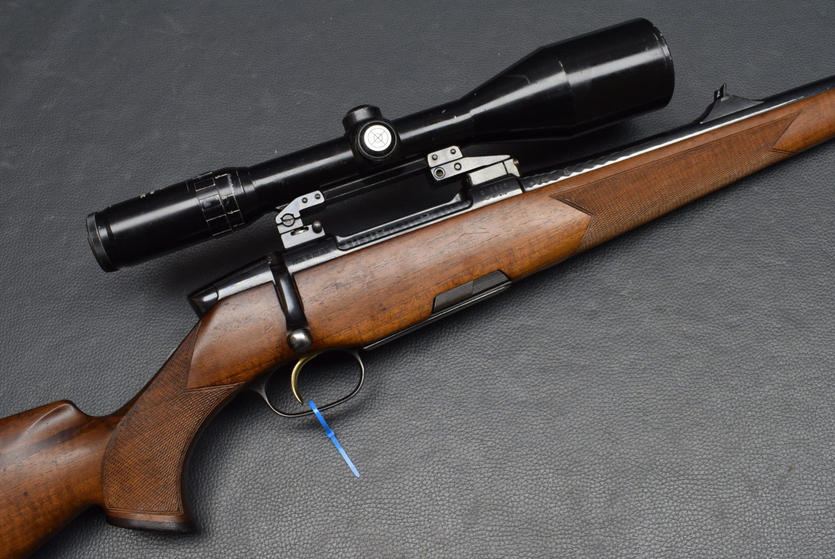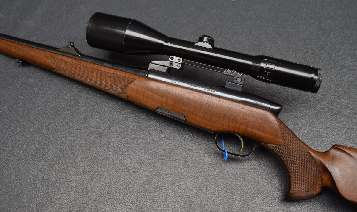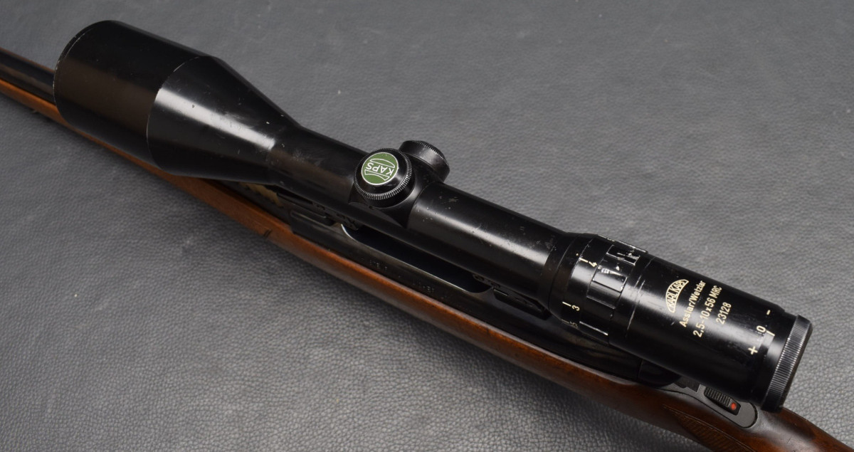 Montiert mit Zielfernrohr Karl Kaps 2,5-10x56 MRC Abs. 4, mittels EAW Montage. Nußbaumschaft mit bayr Backe, Gummischaftkappe und Riemenbügeln Lauf sehr gut, Brünierung 97%, Schaft sehr gut Gebrauchtwaffe, gut