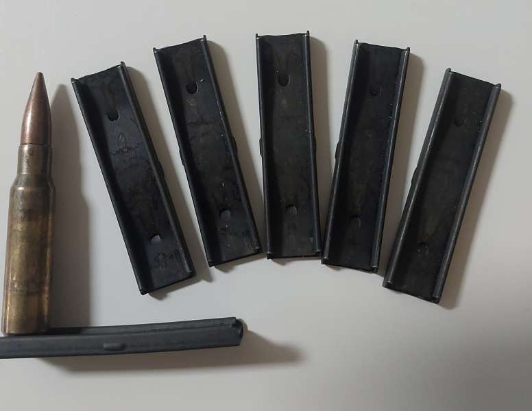 Hier zur Auktion 6 Ladestreifen für je 5 Patronen .308/ 7,62x51.Metallausführung von MFT.Kein Rost, Brünierung perfekt erhalten.Länge 6cm, Breite 1,5cm(außen).Keine Beschädigungen, nicht mal Kratzer.