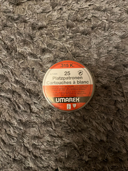 Zum Verkauf steht je Sofortkauf eine Packung 315 K Platzpatronen der Marke Umarex für Schreckschuss Waffen.