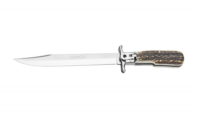 Das neue PUMA Verlängerungsmesser besitzt eine ausklappbare, 19 cm lange Klinge aus rostfreiem 440C Stahl (57–58 HRC). Im eingeklappten Zustand steht die Klinge deutlich über das Griffende hinaus und lässt sich somit auch für feinere Arbeiten nutzen. Das bewegliche Parierelement ("Swing Guard") liegt dabei flach am Griff an und schwenkt beim Ausklappen der Klinge vor den Griff um die messerführende Hand - z.B. beim Abfangen von Wild - zuverlässig zu schützen. Zusätzlich verfügt das „Verlängerungsmesser“ über einen umlegbaren Hebel, der als Sicherung und Entriegelung der mit einer Retro-Beschriftung versehenen Klinge dient. Ausgesuchte Hirschhornschalen und eine paßgenaue Ledergürtelscheide runden dieses formschöne und in hochwertiger Handarbeit gefertigte Solinger Produkt vollends ab.