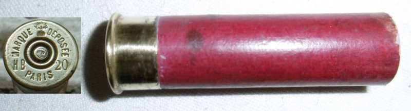 Angeboten wird 1 leere, ungebrauchte Schrothülse Kal. 20. MARQUE DEPOSEE HB PARIS. Diese Hülse lagerte auf dem offenen Dachboden der Büchsenmacherei ERDELT in Neustadt/Haardt (Weinstraße). 100 Jahre haben eine Menge Schmutz hinterlassen, der noch nicht ganz entfernt ist.