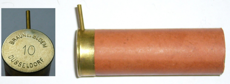 Angeboten wird 1 leere, ungebrauchte Lefaucheux-Schrothülse Kal. 10 in neuwertigem Zustand. BRAUN & BLOEM DÜSSELDORF, hergestellt vor 1925
