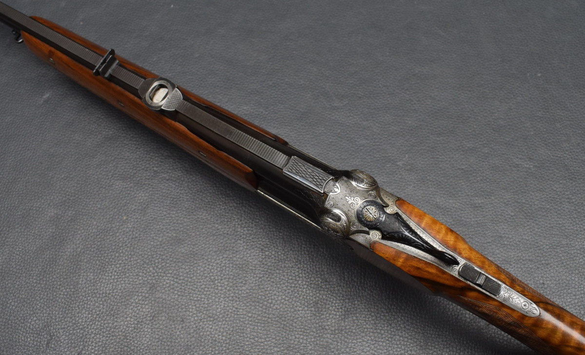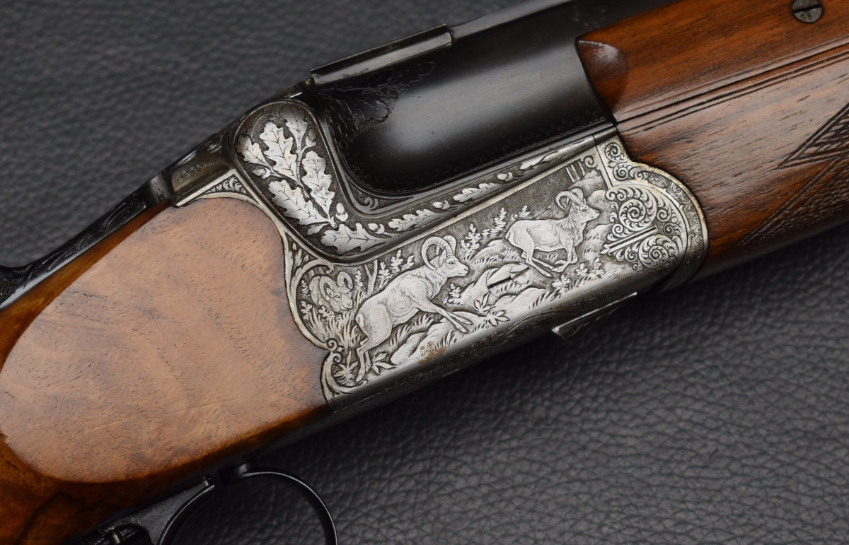 Doppelabzug mit Rückstecher, Abzugsbügel brüniert und graviert, Schwenkmontagebasen.