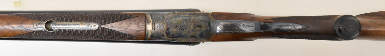 Klassische Querflinte mit Doppelabzug und seitlichen Signalstiften ohne Ejektor. Spiegelblanke Läufe mit halb/voll Choke, strammer Verschluss. Gut erhaltene Brünierung, das Schaftholz mit ein paar Gebrauchspuren. 36,5cm langer Nussbaumschaft mit Backe und Pistolengriff. (Gemessen vorderer Abzug bis Mitte Schaftkappe) Doppelte Laufhakenverriegelung und Schiebesicherung auf dem Kolbenhals. Beschuss von 07/1958.