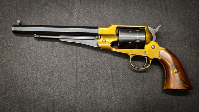 Der Revolver verfügt über einen klassischen Achtkantlauf mit einer Lauflänge von ca. 20,5 cm sowie eine 6-schüssige Trommel. Der Messingrahmen verleiht der Waffe die typische, historische Optik im Stil des Remington New Army und sorgt für ein ansprechendes Erscheinungsbild.