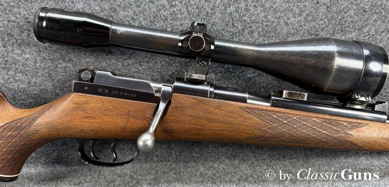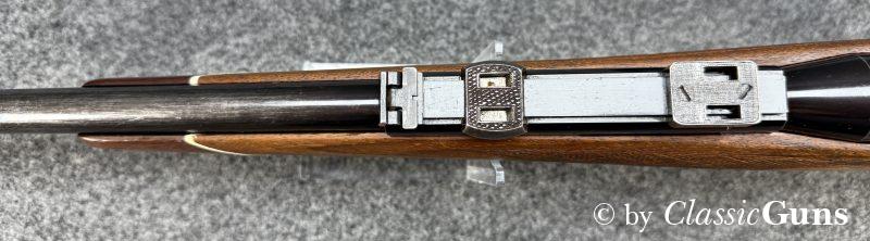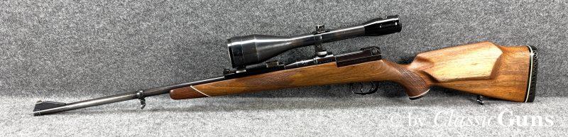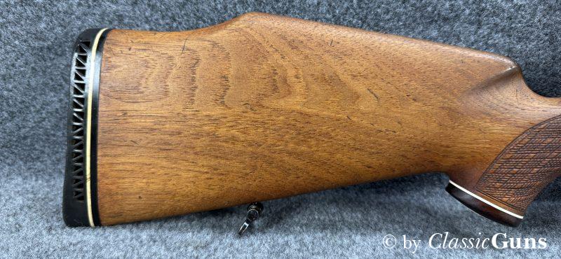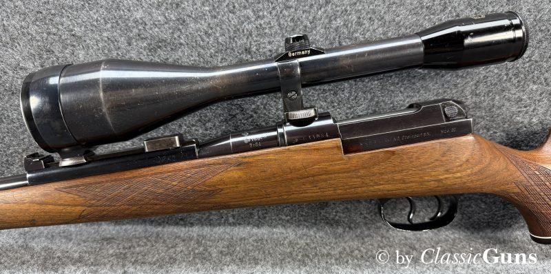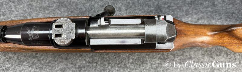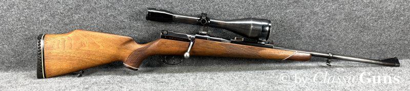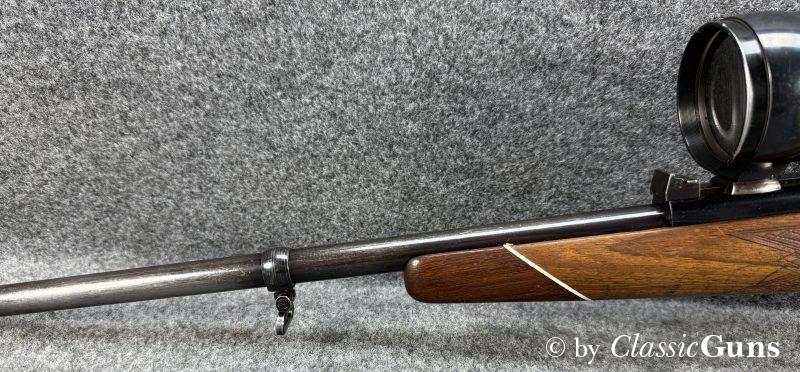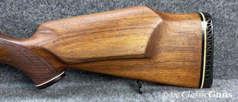 Unter Kennern gesuchte Repetierbüchse, mit dem seinerzeit revolutionären und patentierten Kurzverschluss mit „Teleskopsystem“, welches eine um etwa 90 mm kürzere Bauweise ermöglichte und was bis heute richtungsweisend ist. Äußerlich zeigt die Waffe einige Spuren des jagdlichen Gebrauchs, technisch präsentiert sich die Büchse einwandfrei. Der 610 mm lange Lauf ist innen blank und verfügt über ein sehr gut erhaltenes Zug-/ Feldprofil. Der schlicht gemaserte Nussbaumschaft mit Schottischer Fischhaut, Bayrischer Backe und Rosenholzabschlüssen ist sehr gut erhalten und frei von Rissen, die Schaftkappe ist unbeschädigt. Die Brünierung ist stärker abgenutzt, mit ein paar üblichen Gebrauchs- und Abnutzungsspuren. Der Deutsche Stecher löst sauber aus.