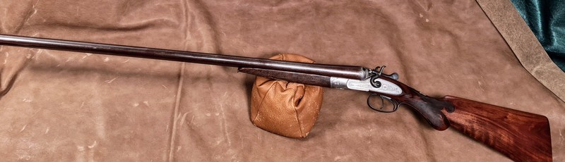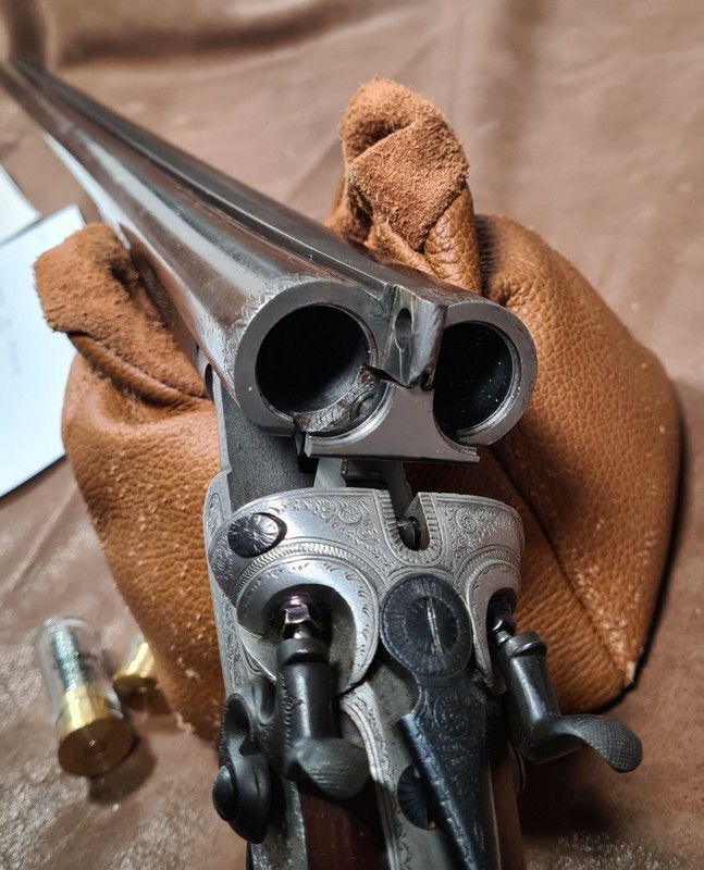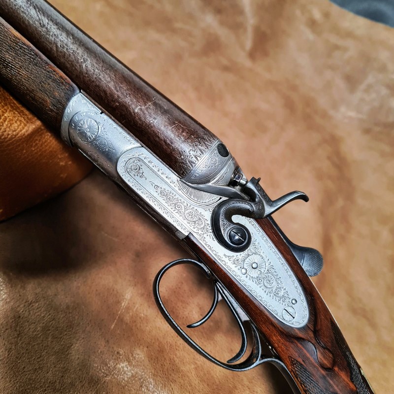 Englische Randstich- und Arabeskengravur, Nussbaumschaft mit feiner Fischhaut (am Vorderschaft leichte Griffspuren),