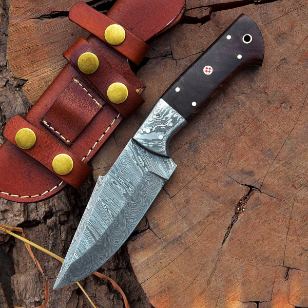 Damast Jagdmesser schöne Klingenmaserung Damast Stahl mit Lederhülle MAQ2010