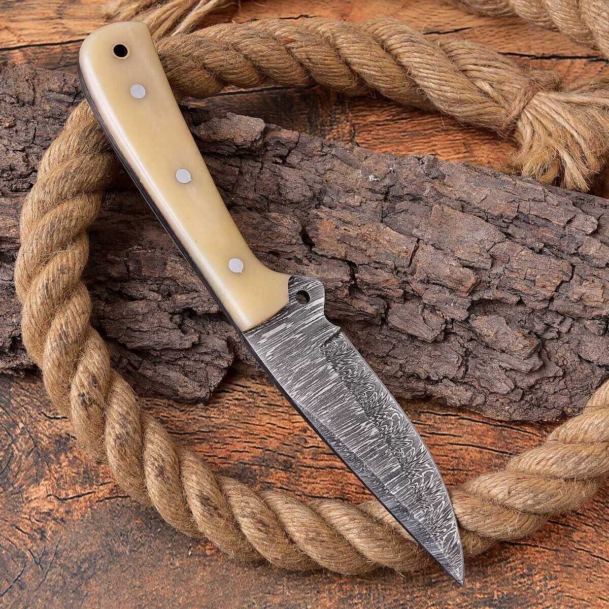 Damast Jagdmesser schöne Klingenmaserung Damast Stahl mit Lederhülle MAQ6132