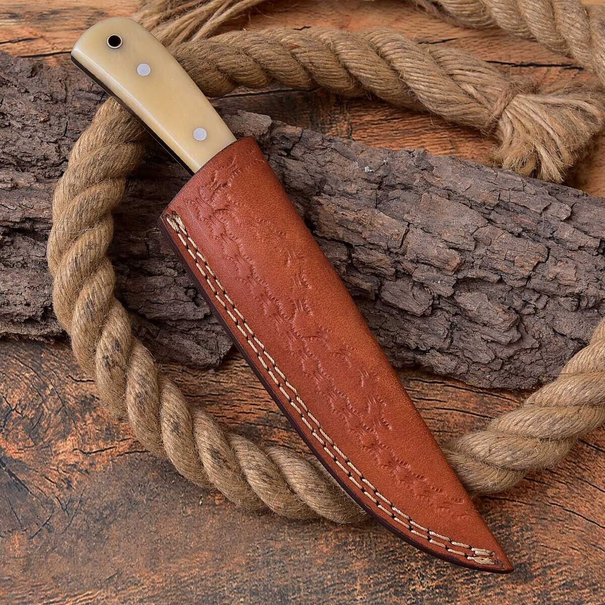 Die ebenfalls handgefertigte Lederscheide besteht aus hochwertigem Rindleder und wurde dem Messer genau angepasst.