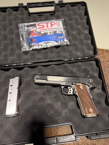 STP Sentry 5.0 im Kaliber .45 ACP in neuwertigem Zustand. Die Pistole wurde äußerst wenig genutzt und weist eine Gesamtschussleistung von ca. 20 Schuss auf. Technisch wie optisch hervorragender Zustand, präzise Passungen und sauberes Abzugsverhalten. Zum Lieferumfang gehören der Originalkoffer sowie ein Magazin.