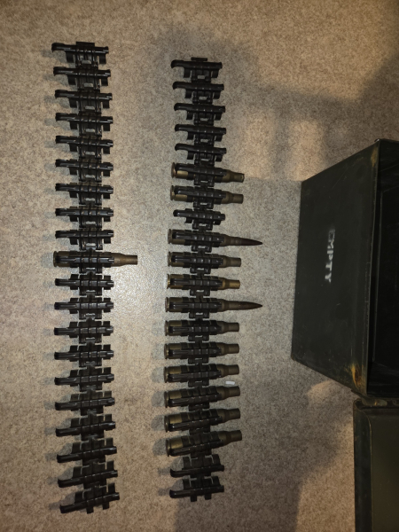 Verkaufe einen Sowjet/russischer Patronengurt Kal. 12,7x108 mit einigen Hülsen und Dummipatronen. Es ind immer Segmente die durch die Patronen zusammengehalten werden, mit einer 50er Munikiste. Egun ich Versand der Käufer ,EU Versand ist möglich ca.19€ .Keine Garantie,Umtausch oder Rücknahme. Siehe auch meine anderen Auktionen-Preisvorschläge sind möglich.