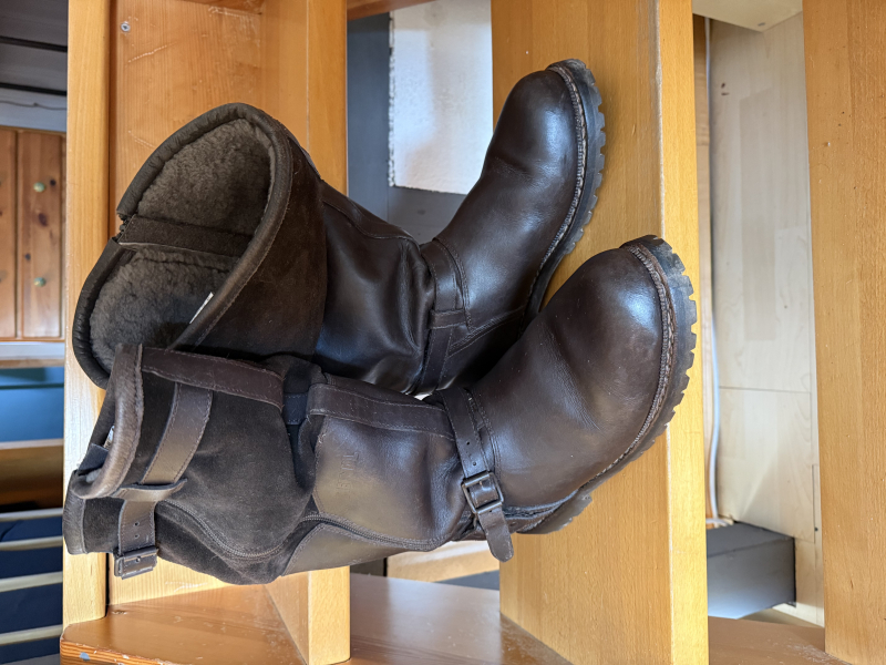 Angeboten werden wenig getragene, braune Meindl Fliegerpelzstiefel mit Lammfell-Futter in Größe 46. Die Stiefel sind intakt, die Sohle in gutem Zustand. Die Reissverschlüsse sind gängig und die Schnallen und Riemen komplett fest und intakt. Die Jagd-Stiefel sind innen komplett mit Lammfell gefüttert und halten sehr warm. Gleichzeitig kann man darin noch sehr gut Laufen. Das Fell innen ist ohne Makel, Risse oder Flecken. Man sieht, dass die Stiefel weitgehend im Schrank standen. Ich habe neue Hanwag-Stiefel geschenkt bekommen und verkaufe deshalb die Meindl Flieger-Pelzstiefel. Der Zustand ist auf den Fotos dieser Auktion ersichtlich.