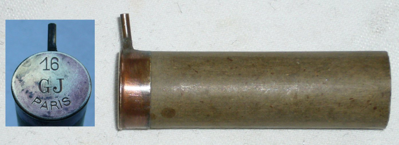 Angeboten wird 1 leere, ungebrauchte Lefaucheux-Schrothülse Kal. 16 Marke "GJ". Eine spätere Fertigung mit eingeprägtem Stempel der Patronenhülsenfabrik Bischweiler/Elsass, Walbinger & Meuschel vor 1914 für Jules Gevelot in Paris. Diese Hülse lagerte auf dem offenen Dachboden der Büchsenmacherei ERDELT in Neustadt/Haardt (Weinstraße). 100 Jahre haben eine Menge Schmutz hinterlassen, der noch nicht ganz entfernt ist.