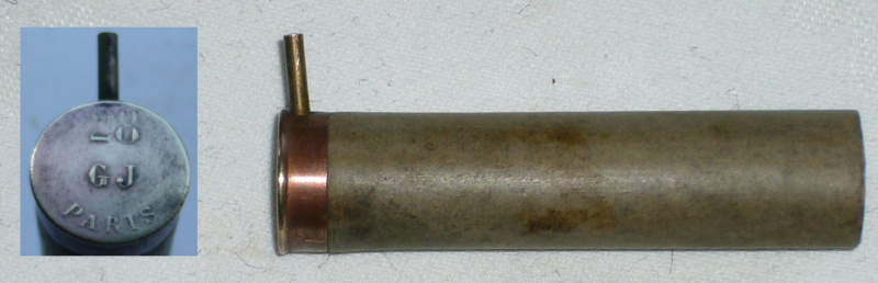 Angeboten wird 1 leere, ungebrauchte Lefaucheux-Schrothülse Kal. 28 Marke "GJ". Eine frühe Fertigung mit erhabenem Stempel der Patronenhülsenfabrik Bischweiler/Elsass, Walbinger & Meuschel vor 1914 für Jules Gevelot in Paris. Diese Hülse lagerte auf dem offenen Dachboden der Büchsenmacherei ERDELT in Neustadt/Haardt (Weinstraße). 100 Jahre haben eine Menge Schmutz hinterlassen, der noch nicht ganz entfernt ist.