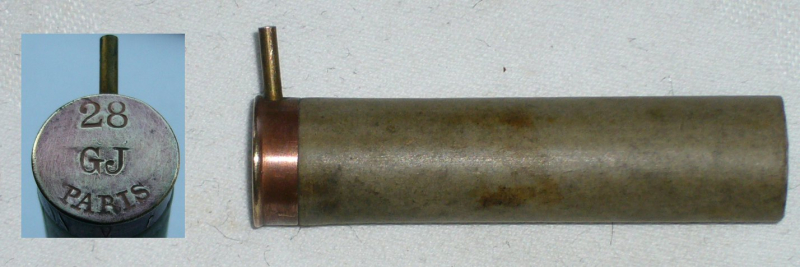 Angeboten wird 1 leere, ungebrauchte Lefaucheux-Schrothülse Kal. 28 Marke "GJ". Eine spätere Fertigung mit eingeprägtem Stempel der Patronenhülsenfabrik Bischweiler/Elsass, Walbinger & Meuschel vor 1914 für Jules Gevelot in Paris. Diese Hülse lagerte auf dem offenen Dachboden der Büchsenmacherei ERDELT in Neustadt/Haardt (Weinstraße). 100 Jahre haben eine Menge Schmutz hinterlassen, der noch nicht ganz entfernt ist.