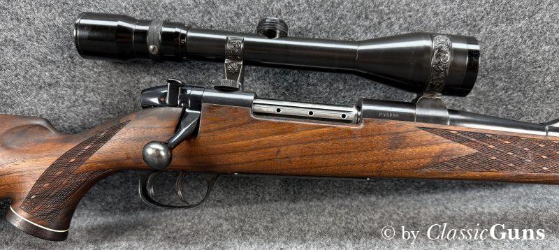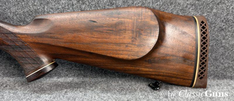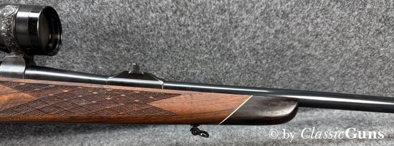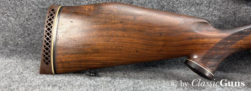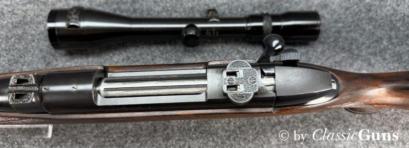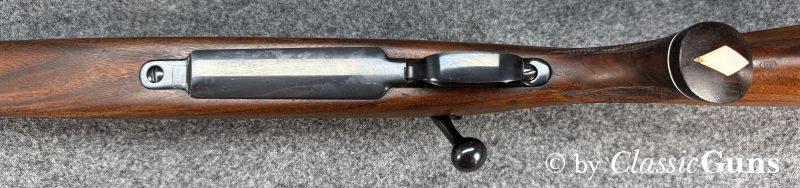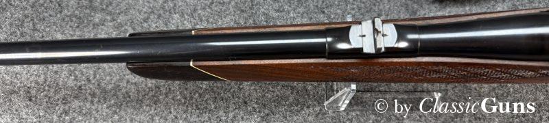 660 mm langer Lauf mit sehr gutem Zug-/ Feldprofil. Sehr gut erhaltene Brünierung mit wenigen Gebrauchsspuren. Der Nussbaumschaft mit Rosenholzabschlüssen ist ebenfalls sehr gut erhalten und mit nur leichten Gebrauchsspuren. Mittelschaftmagazin für fünf Patronen und mit Klappdeckel, Deutscher Stecher und seitliche Sicherung.