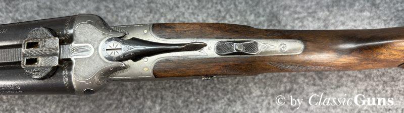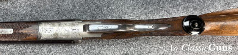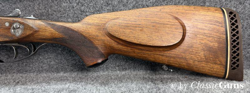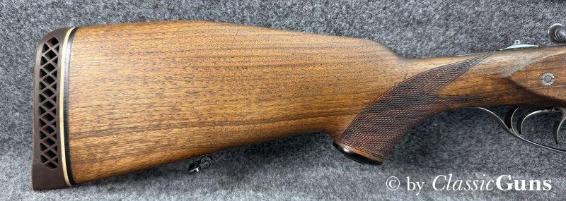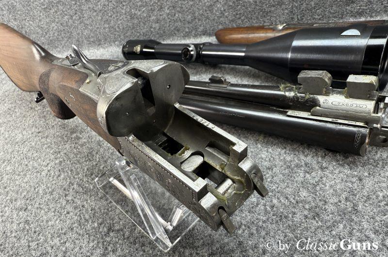 Mechanisch ist der Drilling einwandfrei, der Verschluss ist stramm und dicht. Das Laufbündel ist 630 mm lang. Der Kugellauf ist blank und verfügt über ein sehr gutes Zug-/ Feldprofil. Die beiden Schrotläufe sind ebenfalls spiegelblank, der linke Lauf hat ½ Choke, der rechte ¼ Choke. Rückstecher, Umschalter, Sicherung, Signalstifte und die automatische Kimme funktionieren einwandfrei. Die originale Brünierung der Stahlteile ist sehr gut erhalten. Der schlicht gemaserte Schaft aus Nussbaum zeigt nur minimale Gebrauchsspuren und eine kaum sichtbare, fachmännische Reparatur.