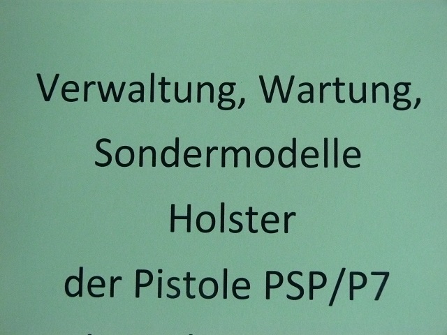 Heft, 50 Seiten, bebildert, Verwaltung der PSP P7 von Heckler & Koch bei Behörde, Inhalt u. a. Auslieferung mit Scheiben und Zubehör, Schießausbildung, Ersterfassung der Waffe, Anschussscheiben und andere, Waffenrevision, Munitionserfassung, Sondermodelle für Ausbildung und Training, Probleme im Laufe der Jahre, Foliensätze zur Ausbildung, Holsterreihen im Dienst, bis hin zur Ausmusterung. Der Käufer übernimmt die Versandkosten.