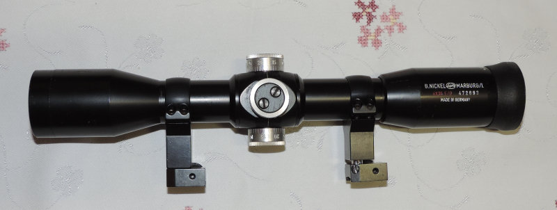 Biete aus Nachlaß: Selten zu bekommendes Zielfernrohr Nickel Supra 4x36 ED für die Disziplin "Laufende Scheibe 10 Meter" - Durchsicht ist klar,ein paar Macken am Tubus und an den Montagen, die bei Gebrauch leider nicht ausbleiben - Die Türme klicken und rasten sauber - die Stacheln bewegen sich wie sie sollen - Montiert ist das Glas in einer 11mm EAW Montage mit Verstellung - Neupreis für das Glas und die Montage ca. 3200€! Alle Angaben nach bestem Wissen! Zustand siehe Bilder! Privatverkauf! Keine Garantie, keine Rücknahme! Versandkosten EU 20€