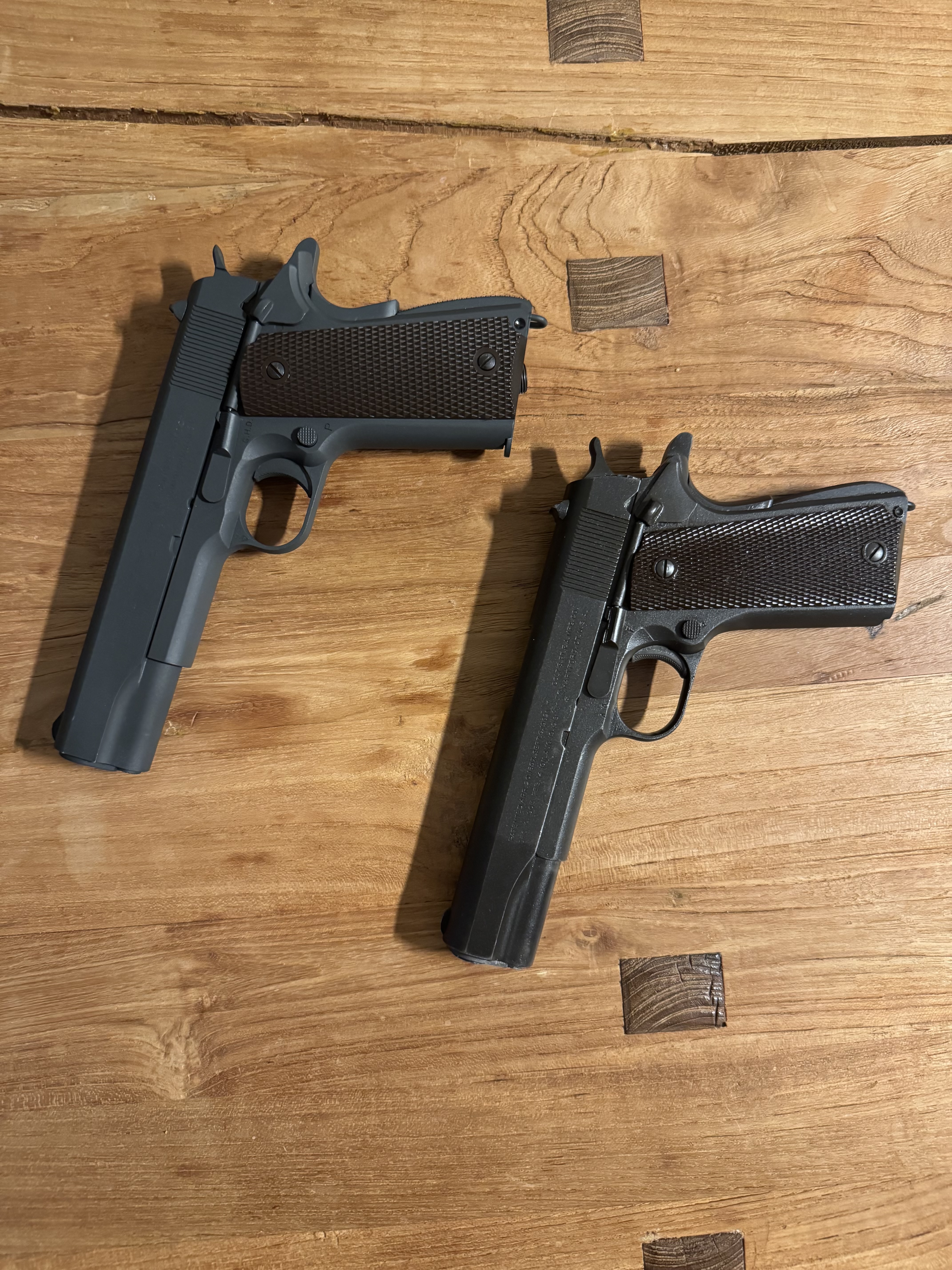 Das letzte Bild als Vergleich hier angebotene Blowback und original 1911 von 1943 ( Original 1911 - links
