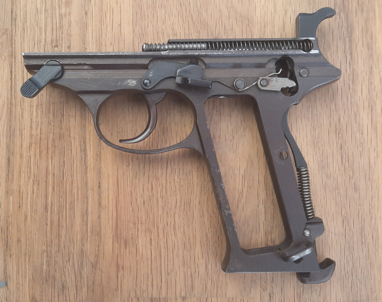 Dieses Griffstück war vom ursprünglichen Eigentümer bzw. Nachkriegs-Vorbesitzer mit dem Verschlussträger und Laufblock einer WALTHER P1 „verheiratet“ worden. Was nun zwar rein technisch betrachtet sehr gut funktioniert, historisch betrachtet aber als grober Unfug gewertet werden darf...