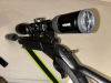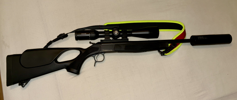 Montiert ist auf der Waffe ein HAWKE Zielfernrohr ENDURANCE 30 WA 4-16x50 mit beleuchtbarem Absehen (fein, ähnlich 4) mit Paralaxeausgleich auf Hebelmontage. Des Weiteren gehört zum Angebot ein fast neuer overbarrel Hausken-Schalldämpfer XTRM II und der Gewehrriemen von Niggeloh und nicht abgebildeter Bergaratasche.