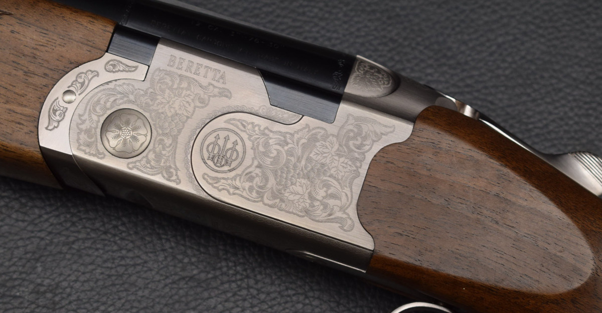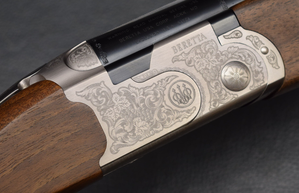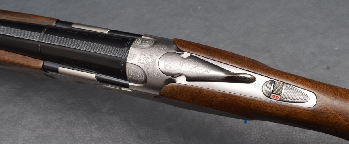Stahlschrot-Beschuss! 6mm breiter ventilierter Schiene, Silber Perlkorn, Ejektoren, Flankenverschluss, vergoldeter Einabzug, heller Stahlsytemkasten mit Gravur, Sicherungsschieber/Umschalter auf dem Kolbenhals,