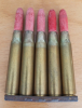 Verkaufe 5 alte Platzpatronen Kaliber 8x57 mit Holzgeschoss auf Ladestreifen.
