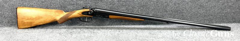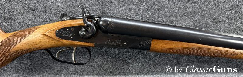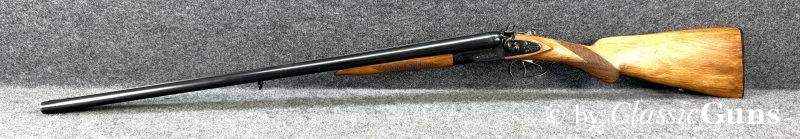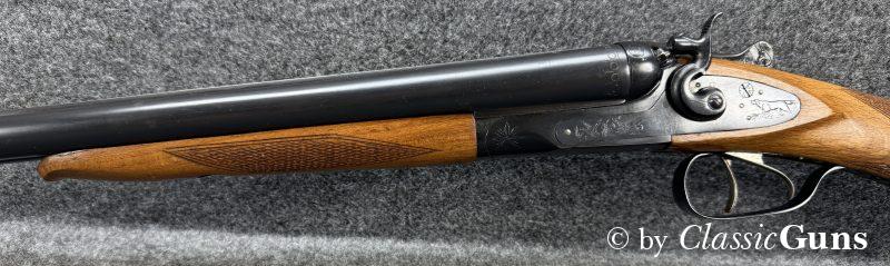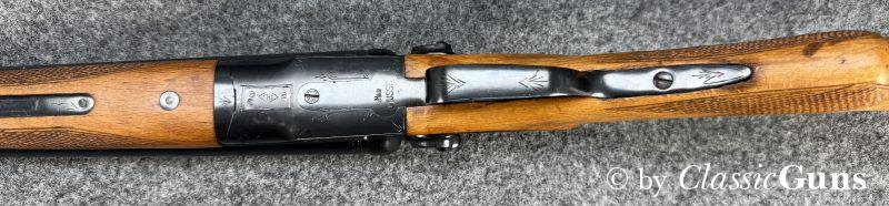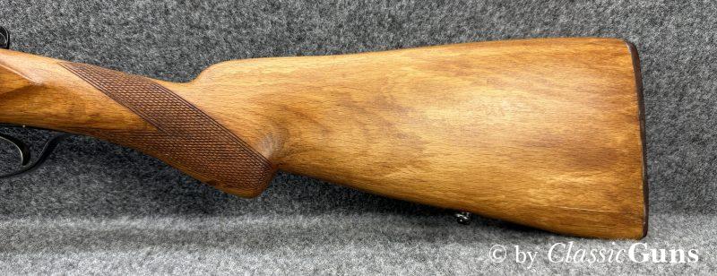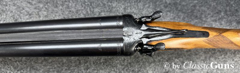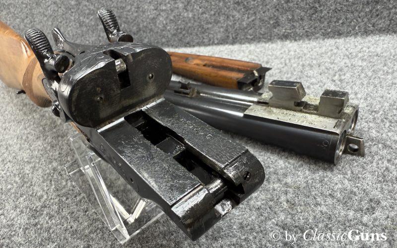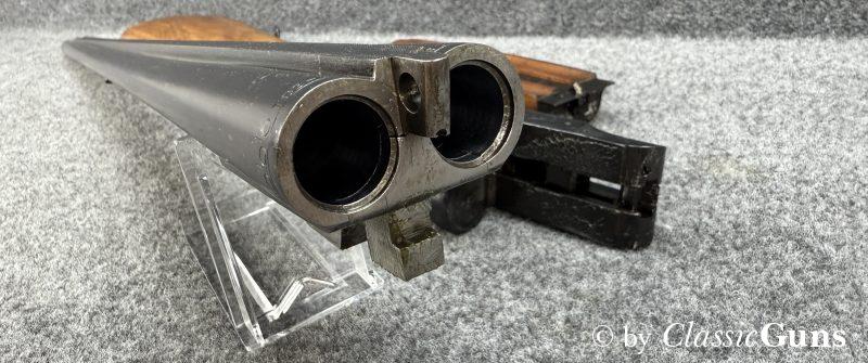720 mm langes Laufbündel, beide Läufe innen spiegelblank, rechts ¾ und links Vollchoke. Sehr gut erhaltene Brünierung und sehr gut erhaltener Schaft aus Buchenholz, Doppelabzug, Auszieher (kein Ejektor) und dichter Verschluss.